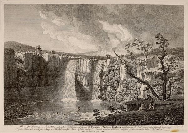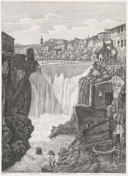 Here we see Giovanni Battista Piranesi's etching, "View of the Falls of Tivoli," which captures a scene of cascading water framed by ancient ruins and dramatic natural forms. The composition is dominated by a powerful contrast between light and shadow, creating a dynamic and almost theatrical effect. Piranesi skillfully uses line and texture to depict the turbulent water and rugged landscape. Notice how the dense, intricate lines describe the rocks and foliage, while the lighter, more fluid lines evoke the movement of the water. This work reflects Piranesi's interest in the sublime, a concept popular in the 18th century that emphasized the awe and terror inspired by nature. The etching isn't simply a depiction of Tivoli; it's an engagement with broader philosophical ideas about the relationship between humanity and the natural world. The contrast between the man-made and the natural is further emphasized by the strategic placement of architectural ruins amidst the natural landscape, prompting reflections on time, decay, and the grandeur of nature over human endeavor. It's this interplay of elements that makes Piranesi's work so compelling.