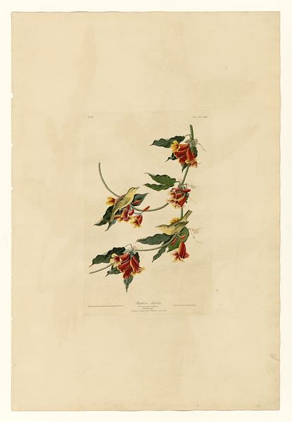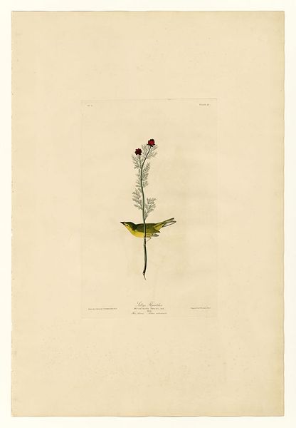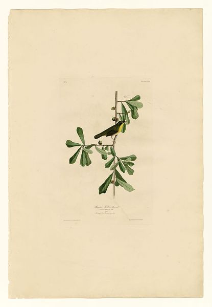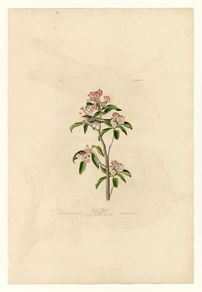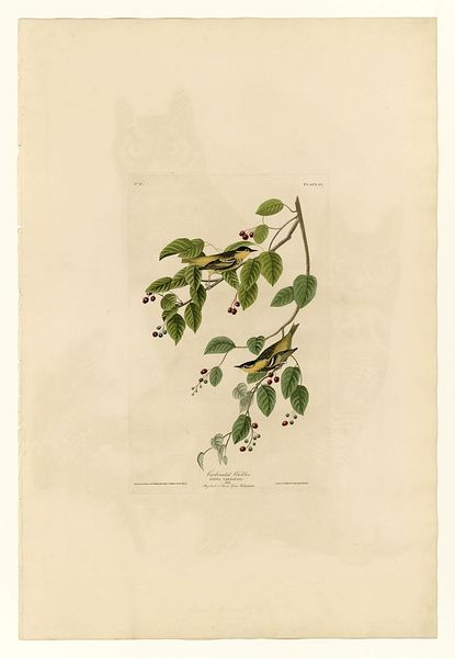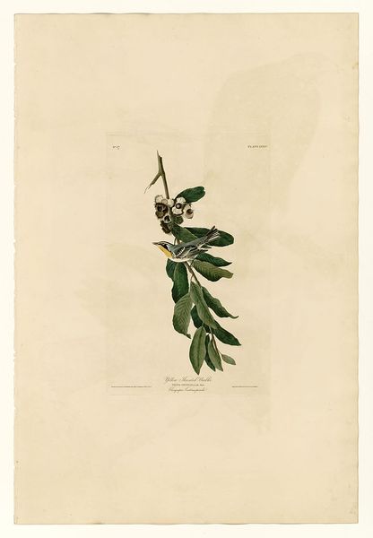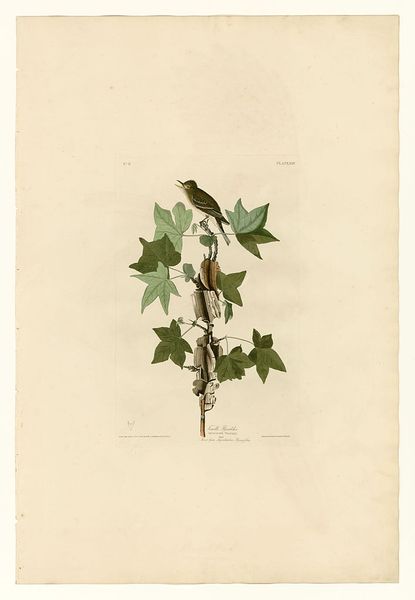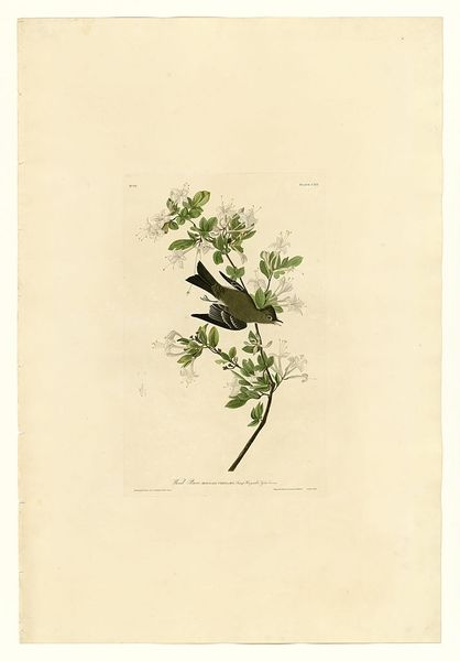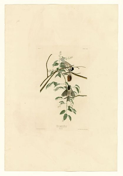 Curator: Here we have "Plate 90 Black & White Creeper" by John James Audubon. It seems to be an illustration or study, rendered in ink and watercolor. Editor: My first impression is one of stillness, but a stillness full of observation. It is like capturing a fleeting moment, an interaction, that allows the artist to examine the plant and bird together. The palette is very subdued, adding a level of complexity and calm. Curator: Yes, and placing this artwork in the broader context of Audubon's oeuvre, we understand it not simply as a naturalistic study, but a document of the early 19th century’s understanding of the natural world—filtered through the lens of colonization and an inherent hierarchy of observation. How did Audubon's perspective as a white male shape these portrayals? Editor: That’s an excellent point. Institutionally, images like these circulated within scientific circles, reinforcing particular power dynamics through knowledge dissemination. There’s a beauty here, undoubtedly, in the delicate brushwork and careful detail, but we have to acknowledge how such images also became tools to rationalize human intervention in the landscape and the subsequent displacement of indigenous populations. Curator: Absolutely. And even aesthetically, the stark contrast in the bird's black-and-white plumage draws attention. It acts almost as a symbolic representation of this tension. The creeping vine it perches upon further suggests fragility, highlighting nature’s precarity, and maybe even hinting at ideas about the exploitation of the natural world during that period. Editor: The creeper itself becomes a loaded image when viewed through this historical framework, a potent symbol that embodies environmental concerns which carry through to the modern age. I’m intrigued by the negative space too; so much of the paper is untouched. This emptiness underscores the solitude, and speaks to a broader historical narrative regarding humanity’s changing role within our natural environments. Curator: Thank you. Considering all the aspects in Audubon's art encourages critical conversations about history, power, and representation—inviting all of us to actively reflect on the complexities embedded within nature studies. Editor: Indeed, viewing "Plate 90" and similar works is a reminder that even seemingly objective renderings of nature can hold deeply relevant insights into the prevailing perspectives during their time.