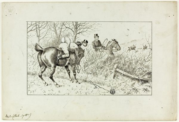 Curator: This is "After the Hounds," an 1886 engraving by William Henry Shelton. There's a notable emphasis on line work throughout the whole composition. Editor: My initial thought is that there is such subdued energy here. Despite the action of the hunt, there’s an underlying stillness in the woman’s posture and the overall monochromatic palette. Curator: Well, consider the means of production: the engraving process itself encourages a precise, controlled application, forcing the subject to be still. That speaks volumes about class and the leisure time of the upper class in late 19th-century society, doesn’t it? Editor: Absolutely. It’s interesting to consider that tension. There’s this implied narrative of a hunt, a pursuit of something, yet the artwork itself presents such a curated and static image. Hunting became a social performance, a way for elites to assert their status, wasn’t it? Curator: Precisely. Even the landscape feels managed. It's Romantic but not wild, emphasizing possession and control over the natural world. This brings to question the artist's socio-economic stance through production—Shelton's market at the time was mostly middle and upper class, wasn't it? Editor: I believe you're right, and how the artwork may serve to validate, reinforce and disseminate cultural ideals prevalent at the time it was produced. It really highlights how art becomes a reflection and tool of social structures. Even the choice of the etching speaks to a particular taste within a segment of society. Curator: Exactly! That linear style becomes another layer of the whole image as cultural artifact rather than the subject being portrayed alone. Thinking about the material limitations of this type of print also reflects class aspirations within a quickly changing society, it’s intriguing isn’t it? Editor: Yes, reflecting on how an image is so meticulously crafted for a specific audience is, I think, incredibly enriching. Curator: Indeed. Considering the social implications intertwined within these production techniques enhances the viewing experience for the observer. Editor: For sure. It helps bring to light how art does so much more than representing; it truly embodies.