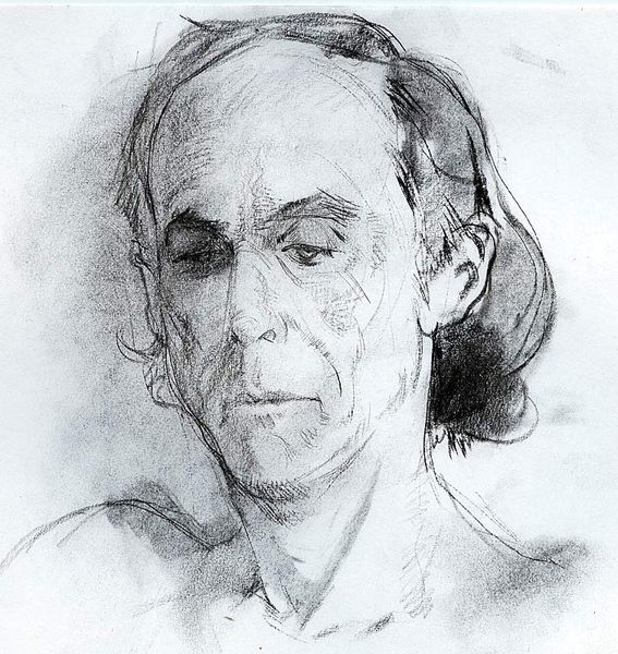 This is Volodymyr Bondarenko’s Self-Portrait, date unknown, rendered in what appears to be ink on paper. The portrait presents the artist’s face in a study of monochrome washes, with a limited tonal range that favors light grays against stark blacks. The composition is asymmetrically balanced, with more detail focused on the right side of the face, drawing our eye there. The stark contrasts in shading are not merely representational, they create a dynamic interplay between light and shadow that conveys emotional depth. The rapid, fluid brushstrokes define the form and give a sense of immediacy. The washes are almost expressionistic and challenge conventional notions of portraiture, pushing beyond mere depiction to explore a more abstract interpretation of self. The artist uses the medium’s fluidity to mirror the instability of identity itself, a concept explored in post-structuralist thought. This work reflects on how we perceive and construct our own image.