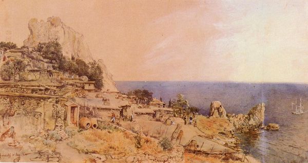 Curator: Here we have Camille Corot's "Voltarra the Citadel," painted in 1834. Look at how that city sits enthroned atop the hills. Editor: It exudes a certain golden-era peace, doesn't it? There's something about the harmonious ochres and gentle sky that evoke a time before… what exactly? Curator: Before disruption, perhaps? Corot was working during a period of intense social and political change in Europe. Romanticism often served as a retreat from the realities of industrialization and urbanization, an escape into a seemingly simpler, more authentic past. We need to question the narrative, who and what does it leave behind? Editor: Indeed. But stepping away from context for a moment, let’s consider the brushwork. Notice the contrast between the hazy, almost dreamlike rendering of the background and the more defined, though still soft, treatment of the foreground trees. This interplay between the indistinct and the distinct creates a sense of depth. Curator: This distinction also emphasizes the spatial dynamics rooted in socio-economic disparity. The elevated citadel is separated physically, mirroring the societal divisions, which become quite pronounced upon reflection. The path acts as a mediator but does not diminish that visual divide. Editor: It’s an interesting compositional strategy, and even more so when you notice how the light bathes the citadel in a way that seems to idealize its stature, which prompts the viewer to consider this societal separation. Curator: The piece reflects and perhaps reinforces societal power structures. Was Corot deliberately offering social commentary? Or was he merely reflecting the values of his time? These are critical questions to ask ourselves. Editor: Ultimately, Corot masterfully leads our eyes through a series of forms, drawing us ever upward to this idealized version of the citadel, while reminding us of the natural beauty surrounding, a perspective no doubt heightened by its materiality. Curator: Art’s significance evolves in response to social discourse. Thank you for reminding us of how its power remains deeply interwoven with identity.