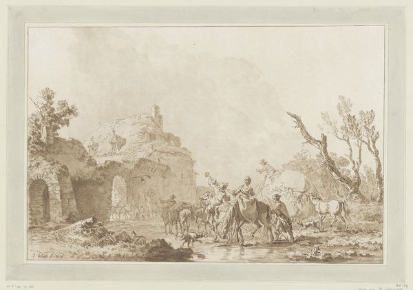 Curator: Here we have "The Journey of Jacob into Egypt," an etching rendered in ink by Stefano della Bella, likely dating to the 17th century. Editor: The immediate feeling is one of a mass migration, an exodus. The mountains are impressive, but there’s an underlying sense of strain. You feel the weight of their journey. Curator: Della Bella was a master of etching, using the technique to create wonderfully detailed and animated scenes. It is interesting to observe the scale; though a historical piece, this feels intimate due to its reduced dimensions. How might the means of its creation impact its social resonance at that time? Editor: The journey itself, and the animals weighed down, evoke stories of movement, survival, and promises fulfilled. Note how they traverse both up and down the slopes. The movement speaks to a very foundational level of human need and perhaps resilience. Curator: Consider the materials: ink on paper. How easily could it have been circulated? Perhaps it was made with a printing press, or perhaps by some other mechanism? This image of mass migration, reproduced through prints, may well have broadened the audience of this ancient, revered story. Editor: Precisely! These figures and animals resonate across centuries. We recognize them, not just as literal migrants, but also as symbols of shared experiences and the cyclical nature of history. Jacob is entering a land where his descendants will become enslaved. Curator: And what is it about the ink that permits such tonal shifts in texture across these various forms? Perhaps it allows for an image that could easily be carried. Or might we investigate what chemical composition enabled the artist to achieve such dynamic results during this era? Editor: For me, it reinforces the idea that art, regardless of medium, serves as a powerful means for carrying the human narrative. And perhaps, it also hints at themes of displacement. Curator: A lot to ponder. Thank you. Editor: Indeed, an epic tale captured in fragile lines.