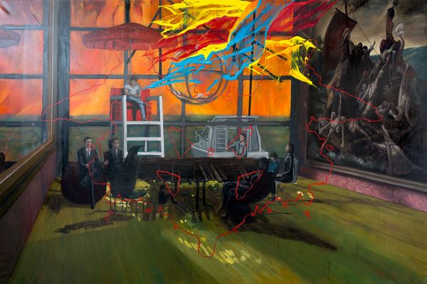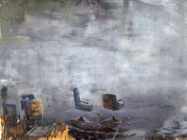 Editor: Jarik Jongman's "NSA data center, Bluffdale, Utah," painted in 2019. It's quite striking, all shimmering golds and ominous darks rendered in oil. There’s something unsettling about it, like a distorted memory. What symbols or hidden narratives do you think might be at play here? Curator: Unsettling is an apt word. Consider how Jongman chose to represent this physical structure – a place built to observe. See how the golden light, usually a symbol of the divine or preciousness, feels almost sickly, artificial? Is this the "gold" of information, and what price is exacted to obtain it? Editor: That's a powerful point, reframing gold as something almost toxic. I hadn't thought about the idea of observation as an inherent symbol. Curator: Exactly! Think of the all-seeing eye, a motif that's echoed throughout various cultures, signifying power, knowledge, or even surveillance. This structure *is* an eye in the modern world, collecting data. Notice the abstract expressionist style – the unease conveyed through broken, geometric shapes? Are those "lines" of code… or are they prison bars? Editor: I see what you mean. It’s as if Jongman’s using these fragmented images to create a sense of claustrophobia and overwhelming control. Are these painterly styles meant to suggest a lack of clear answers? Curator: Precisely. The lack of resolution forces *us* to complete the narrative. Jongman isn’t giving us answers but rather posing questions about authority, privacy, and the psychological impact of constant monitoring. It forces us to look at symbols of safety differently. Editor: That's fascinating. It changes my perception of the painting entirely. I’ll definitely consider those layers of symbolic meaning going forward. Curator: Indeed. Remember, visual symbols can be powerful tools for uncovering deep-seated cultural anxieties and power structures. Every artistic choice resonates!