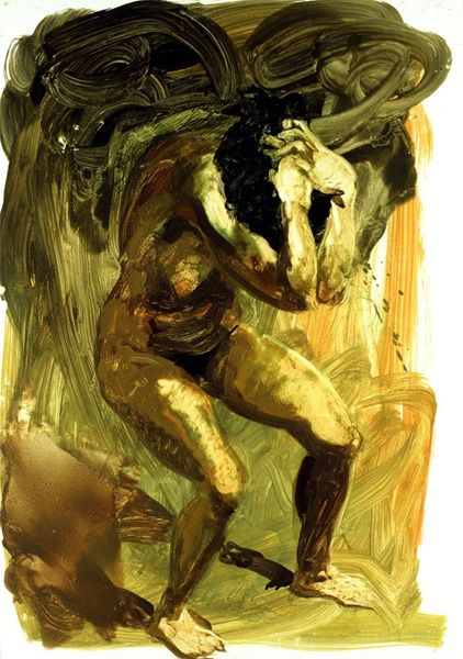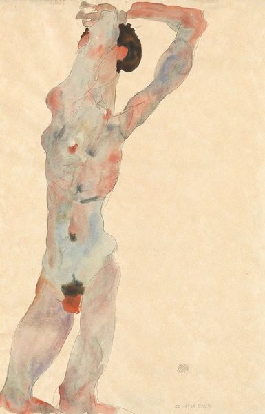 Editor: This is Egon Schiele’s "Self Portrait with Raised Arms, Back View," from 1912, in watercolor and oil. The figure is turned away, vulnerable somehow. What do you see in this piece that I might be missing? Curator: The raised arms immediately bring to mind gestures of supplication or surrender, a universal language transcending time. But the fact that we see the back, the most unprotected part of the body, speaks volumes about vulnerability. What do raised arms, coupled with the obscured face, say to you? Editor: Perhaps an offering of the self? Like, "Here I am," but without revealing all? It's intimate and distancing at the same time. Curator: Precisely! The back, historically, has symbolized secrets, the unseen, the burdens we carry. By presenting his back, Schiele engages with this symbolic weight, suggesting inner turmoil, hidden truths he’s grappling with and inviting us to ponder ours. Notice how the stark lighting emphasizes the musculature—an almost Christ-like agony in the garden pose? Editor: I hadn't considered that connection. So, it's more than just a physical portrait, it's a... psychological landscape? Curator: Indeed. Schiele uses his own image as a vessel for exploring universal themes: anxiety, isolation, the search for identity. The hands especially resonate-- almost claw-like, beseeching. The palette echoes the angst—earth tones and blues suggest a burdened soul. Editor: So the visual language works to deepen the themes beyond just showing a back and raised hands. Curator: Exactly. The emotional and cultural significance here rests in that interplay, how it speaks across time and culture. I think looking at this work has really clarified how symbolic the body can be. Editor: I completely agree. Thinking about the history and psychology embedded in this image gives it such resonance.