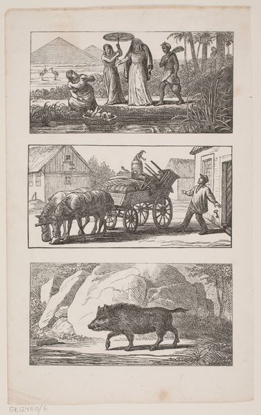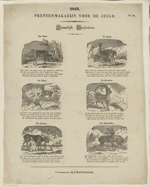 Curator: Well, isn't this peculiar. What we have here is "Dieren," or "Animals," a print by Dirk Noothoven van Goor, dating from around 1850 to 1881. It's an engraving, with a distinctly naturalistic style. Editor: It feels like a page torn from an old textbook—slightly dusty, a bit forlorn. The rigid arrangements of creatures give it a static, almost tragic mood, like specimens pinned under glass. Curator: It does have that air of scientific categorization, doesn't it? But think about who the intended audience was: "Voor de Jeugd"—"For the Youth." It's educational, aimed at sparking curiosity about the natural world. Editor: I’m more struck by the artificiality. Look at that giraffe crammed into its little box! These are animals stripped of their habitat, presented as commodities. The implication of imperial power—capturing and cataloging, extracting for observation… Curator: That’s certainly one way to read it. I suppose I see it as a product of its time. There was a genuine desire to document and understand the world, albeit through a lens that we now recognize as deeply problematic. There's a strange innocence there too. Editor: I see less innocence and more blatant display. How were these animals obtained? At what cost? The images don't show that. Instead, we are encouraged to simply marvel at their existence, perpetuating an unequal power dynamic. Even the poems under each print offer a warped moral. Curator: Perhaps. But isn’t art also about opening a window, even a flawed one? This print, despite its limitations, can spark conversation about our evolving relationship with the environment and our responsibilities within it. Editor: I agree that art can open conversations, but we need to be aware of who gets to control the narrative and how these visual representations reinforce power structures that continue to impact our lives today. These animals, here, silenced by representation.