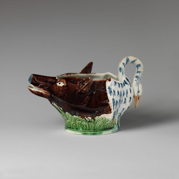 Editor: We're looking at a charming Incense Container, shaped like a bird, made sometime between 1800 and 1859 by Miyagawa Chōzō. It's terracotta, with beautiful glazing. The detail in the feathers is amazing. What do you see in this piece that resonates symbolically? Curator: It’s a fascinating piece. Birds in art are often connected to the soul, and transcendence. Consider how the rising smoke from the incense would visually connect with the bird. What comes to your mind when you think about the context this container served in? Editor: Well, incense is typically associated with ritual, purification, maybe even connecting with ancestors...so that makes the bird-soul connection even stronger. Curator: Exactly. In Shinto and Buddhist practices, birds can carry prayers to the heavens. Does the container's physical presence also hint at the spiritual weight the artwork might have? Editor: The heft of the terracotta, combined with delicate glazing, it creates a very intriguing balance... something grounding with the promise of ethereal lightness. Curator: Consider how these sensory qualities, scent, texture, even color, were experienced by those using this container. What emotional impact would that have? Editor: It suggests a peaceful contemplation, I imagine... a space for mindful awareness. Curator: Yes, indeed. Visual and sensory culture, and how objects create emotional connections between humans, their belief system, and even their ancestors. It's a little reminder that even everyday objects carry cultural memory within. Editor: I never thought of it that way before – how potent everyday objects can be! Thank you.