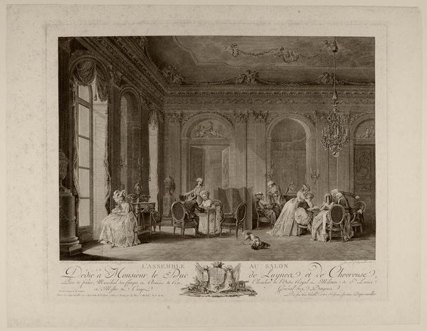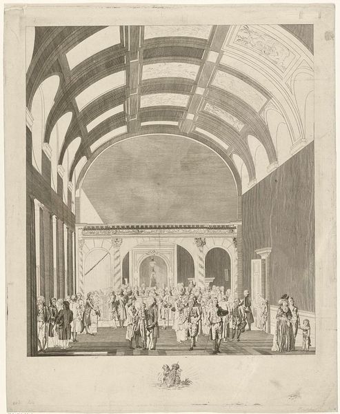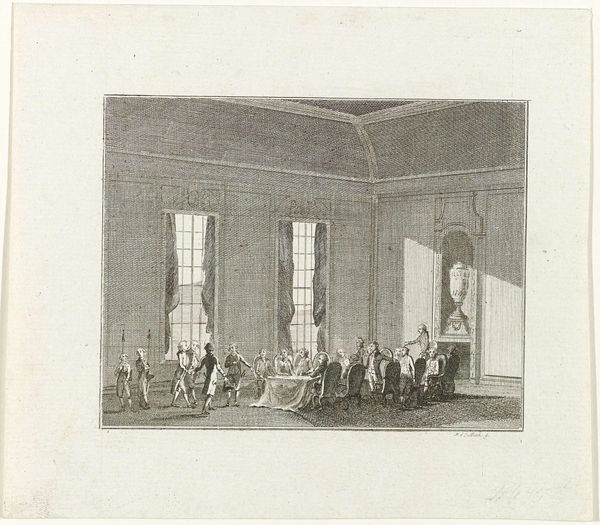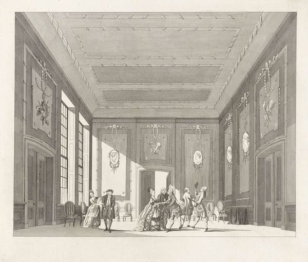 Reinier Vinkeles created this stage design, "Toneeldecor: Hedendaagsche Kamer," using etching. The print, now at the Rijksmuseum, invites us to consider the theater as a space where social norms are both performed and critiqued. Reflecting on Dutch society, it is clear that gender and class were often dictated by one’s position within the domestic space. A room, such as the one depicted here, wasn’t merely a physical structure; it was a stage upon which social identities were enacted. The architecture of the room speaks of affluence and order, but the characters suggest a rupture of that order. The exchange between the figures seems staged, embodying a particular form of social theatre. The women are adorned in elaborate dresses that emphasize their status, yet perhaps constrict their freedom. What alternative narratives might the artist be trying to imply? This print evokes a sense of the emotional constraints placed upon individuals within the rigid structure of 18th-century society, and the hidden tensions simmering beneath the surface.