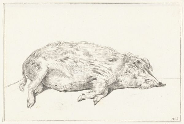This drawing, ‘Liggend varken, naar rechts’ was created by Jean Bernard in the late 18th or early 19th century, using graphite on paper. Graphite, a form of carbon, allows for the creation of tonal variations and textures, seen here in the rendering of the pig’s bristly coat. The artist employs hatching and shading techniques, building up layers of graphite to give the pig a sense of volume. The choice of graphite, a relatively inexpensive material, speaks to the work's function as a study. The artist has captured the animal's form with efficiency, suggesting a keen understanding of anatomy. There's a palpable sense of weight to the animal, emphasized through the subtle gradations of tone. By focusing on the materiality and process, we can appreciate how this seemingly simple sketch reflects both artistic skill and the social context of artistic practice in Bernard's time. It challenges the distinction between fine art and craft, showing the value of observational drawing.