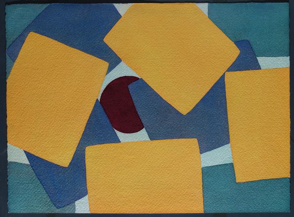 Editor: We’re looking at an Untitled work, likely a painting, by Michel Carrade. It's made using watercolours on paper and features a geometric, colour field style. It’s surprisingly calming despite the blocks of colour, almost like looking at a sunset in strips. How would you interpret this piece in the context of art history? Curator: Colour Field painting often explores the emotional impact of pure colour and form, and its rise can be linked to a broader shift in the art world away from representational art after World War II. Consider, the social and political environment, particularly anxieties around technology and the search for meaning in a rapidly changing world. Does this work’s calming effect, as you noted, act as a sort of visual solace against that backdrop? Editor: That’s interesting; I hadn’t considered the historical context impacting abstraction so directly. Were there specific artistic movements influencing Carrade's choice to work with these kinds of colours? Curator: Definitely. The legacy of early abstraction, movements like Bauhaus which aimed to merge art, craft, and technology into a unified aesthetic are important. The embrace of pure abstraction and emphasis on the surface plane were not merely aesthetic choices, but reflected a desire for a universal, accessible visual language. What role do you think the slightly irregular lines between colours have? Editor: They soften the stark geometry. Instead of being cold, it feels more human. Maybe a subtle rebellion against the uniform aesthetic you mentioned? Curator: Perhaps. And by the time Carrade was working, institutions were far more accepting of abstraction. The market also played a role; abstraction became increasingly valuable. Considering its “Untitled” nature, how much does our own social context dictate our viewing, or does the artist leave room for us to fill that void? Editor: That’s a fascinating point. It highlights how art and its reception are shaped not just by the artist, but by the society observing it. I’ll definitely view abstract works differently now! Curator: It's crucial to acknowledge the many levels upon which we view art. Thanks to our conversation, I see anew this work as an intersection of socio-cultural forces and personal artistic choices.