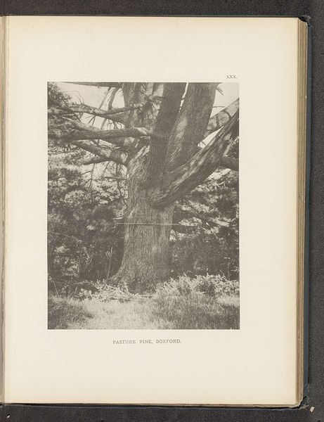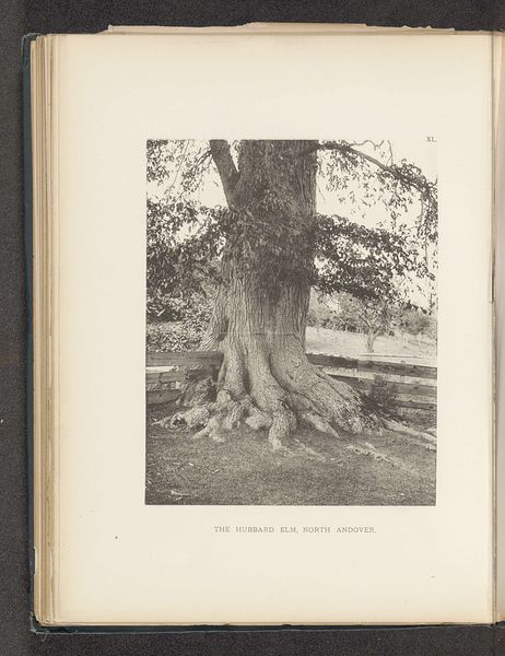 Editor: This photograph, titled "The Willard Elm, Deerfield," created before 1890 by Henry Brooks, is a gelatin-silver print showcasing an imposing tree. I find the strong verticality and texture quite striking. What do you see in this piece from a formalist perspective? Curator: The formal elements are indeed quite powerful. The composition relies heavily on the tree's vertical presence, bisecting the picture plane and creating a strong, stable structure. Note how the textures of the bark dominate the image. The photograph creates a kind of dialogue between the rough bark and the diffused light in the background, setting the spatial and tonal range. What impact does that contrast achieve, would you say? Editor: I think the stark contrast makes the tree feel almost monumental, but also sort of isolated within the composition, like it is not relating much to its background. It emphasizes the physicality of the tree itself. Curator: Precisely. The interplay of light and shadow, carefully orchestrated across the surface, accentuates form. Notice, too, the tonal scale employed, largely within a narrow band of greys, creating visual interest with very little difference in color value. Editor: That's interesting. The use of grey is striking and it emphasizes the texture in the bark so much. Curator: So, by analyzing these formal choices—the stark composition, the monochrome palette, and the tactile quality achieved through light and shadow—we gain insights into the aesthetic intentions of Brooks, regardless of what might have been intended at the time. We have an intensified sensory encounter through compositional analysis. Editor: This has really shifted how I was looking at the work. Seeing how you analyze light and shadow is really exciting. Curator: Indeed, through that approach of breaking down formal components, we recognize how an artist can elicit sensations and emotion through the interplay of shape, line, texture, and contrast. The visual language contains the message itself.