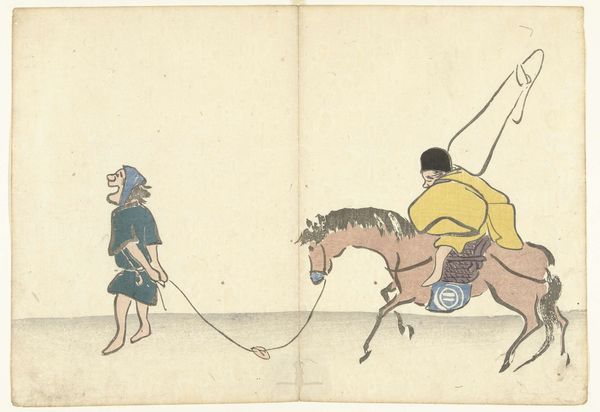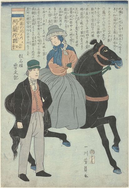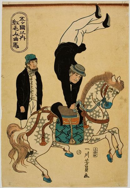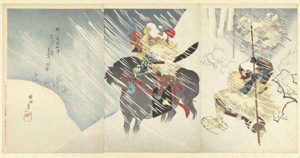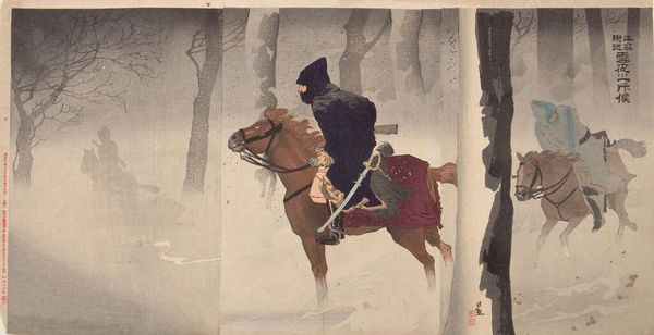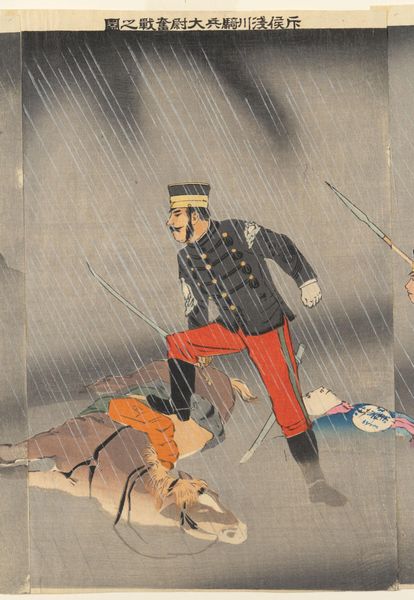 Editor: This woodblock print, "The Heroic Fight of Cavalry Scout Captain Asakawa" by Kobayashi Kiyochika, really conveys a sense of struggle in the downpour. What stands out to you about the composition of this piece? Curator: The artist’s use of diagonal lines is striking. Notice how the driving rain, the captain's leaning posture, and even the horse's body all contribute to a dynamic, almost unstable composition. It suggests movement and resistance simultaneously. How does this linear emphasis impact your reading? Editor: It definitely adds to the feeling of urgency! I can almost feel the rain. I wonder if the diagonal lines may add some dynamism to the narrative. Curator: Precisely. The linearity amplifies the narrative by creating an immersive environment. I find it interesting to ponder how this intrinsic aspect reflects the socio-political context of this image. Editor: Absolutely, I learned a lot about reading the artist's intention through the formal elements. Curator: As did I, noticing your enthusiasm in exploring this piece of art.