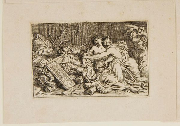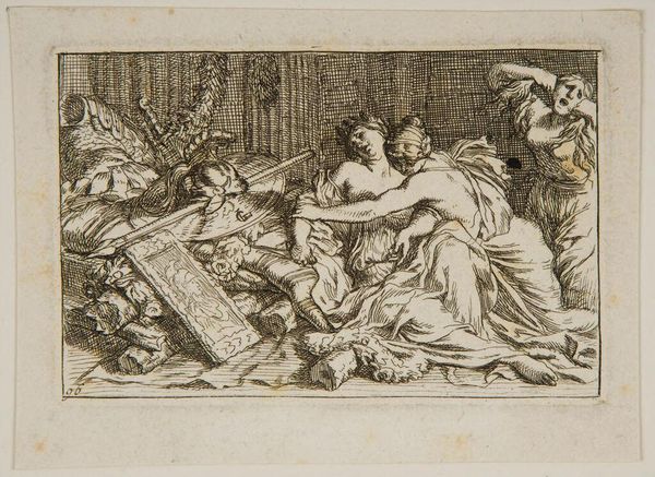Editor: This is Gerard de Lairesse's 1668 etching, "Death of Dido", currently at the Rijksmuseum. It looks very dramatic, all swirling lines and heightened emotion. The stark contrast created by the etching process amplifies the sense of tragedy, I think. What do you make of it? Curator: The tragic drama certainly is apparent, but consider for a moment Dido's story. This image serves as a potent emblem of betrayal and its consequences. Dido, abandoned by Aeneas, chooses death over a life without him. Look at the objects around her: symbols of her former power and status, now rendered useless, discarded even. Editor: I see the armour and what looks like a royal banner. What about the other woman embracing her? Curator: That is likely Anna, Dido’s sister. Notice the blindfold – perhaps hinting at the blindness of passion or even fate itself. Remember, symbols such as the blindfold become charged through repeated use across art and time. Their appearance here reinforces an emotional and intellectual understanding we bring to this scene. Are you familiar with the story of Dido? Editor: Yes, Virgil’s *Aeneid*. So, you're suggesting that De Lairesse is not simply illustrating a scene, but also building upon centuries of accumulated meaning associated with this narrative and the symbols it employs? Curator: Precisely! And etching itself, with its precise lines and capacity for detail, reinforces this sense of controlled, almost intellectual, mourning. It's not just about the raw emotion, but the enduring legacy of the story and its power to resonate through images. Editor: I never thought about it that way, about how much the history of the symbol informs its reading. Curator: Consider the image an anchor into the collective conscious. This work invites us to unpack those layers of meaning and find our own connection to it. It’s quite rewarding, don’t you agree?