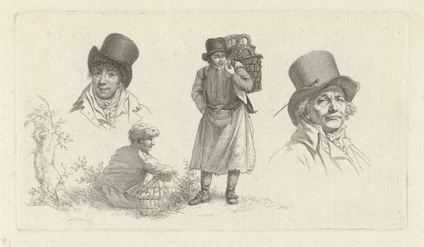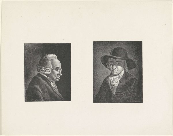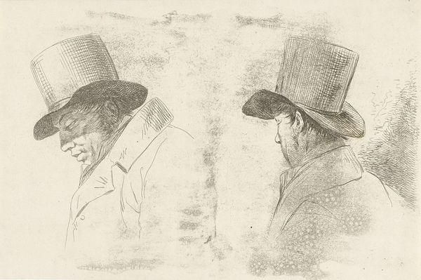 This image of two men wearing hats was made by Anthonie Willem Hendrik Nolthenius de Man, using pen and ink. This choice of material has a direct impact on the artwork's aesthetic; the fineness of the pen allows for detailed linework, capturing the nuances of light and shadow with precision. The social context of this piece is tied to the culture of portraiture and the importance of attire, particularly hats, as signifiers of status. The artist's technique involves layering fine lines to build up tonal depth, creating a sense of form and texture. The cross-hatching method used to define the contours of the faces and clothing is reminiscent of traditional printmaking. Considering the amount of labor that went into this drawing invites us to reflect on its value, and its relationship to commerce. The artist has elevated a simple sketch into a statement, challenging the conventional hierarchy between fine art and more functional forms of visual expression.