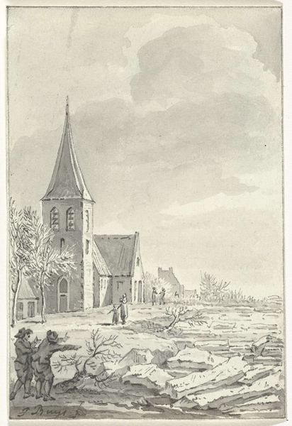 Curator: Jacobus Buys’ “Extreem hoge waterstand bij Scheveningen, december 1790,” likely created between 1790 and 1801, captures a somber moment in time. I find the stark rendering and almost monochrome palette evocative of a stormy day on the Dutch coast. Editor: It feels very…precarious, doesn't it? The entire composition teeters on the edge, mirroring the high water about to consume the town. You can almost taste the salt spray! Curator: The piece certainly conveys that sense of unease. Crafted with pencil on paper, Buys uses delicate lines to detail the townscape—the church tower rising defiantly against the tumultuous sky, the small houses huddled together. It feels so Realist. Editor: There’s an interesting dichotomy at play. On the one hand, you have this commitment to depicting the scene accurately; but then the Romantic elements surface through the drama of the storm. The water, particularly, seems rendered to convey power. Semiotics might suggest we read this as nature’s indifference, a rebuke to human endeavors. Curator: Indeed. The contrast between the sturdy architecture and the restless sea highlights humanity's vulnerability to natural forces. Look how the figures trudge wearily across the makeshift bridges; a sense of helplessness seems to pervade everything. Editor: And yet, there's a stubborn refusal to surrender. People are walking. The houses are there. Life goes on, however changed it is, which brings us to the importance of context and maybe an intentional focus of the ordinary population. We never see the high authorities. It is only ever normal folks depicted with normal actions in romantic times. Curator: Absolutely. It’s a snapshot of resilience as well as disaster, and something deeply moving lies in that tension. The limited tonal range and delicate lines help give a melancholic hue which contrasts wonderfully with this theme of survival. Editor: The artwork then really offers multiple readings, with this interesting tension between a commitment to stark realism mixed with romantic sentiments in a historical portrayal of the strength of the everyman in a dramatic setting. I will now look at my garden after visiting here and give it another view! Curator: Precisely. Buys reminds us of our inherent capacity to withstand, adapt, and rebuild. A simple sketch, yes, but full of subtle grandeur and resonant meaning for our times as well.