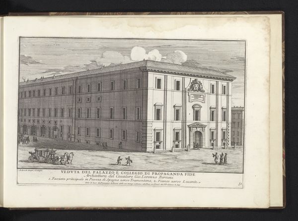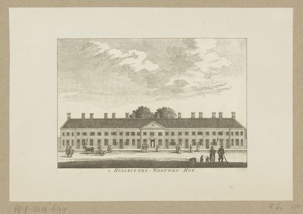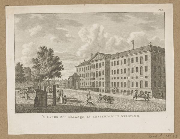 This detailed monochrome print depicts the Aalmoezeniers Orphanage in Amsterdam. Immediately striking is the architectural precision and the use of linear perspective, drawing our eyes along the building’s facade, a testament to the engraver’s technical skill. The rigid symmetry in the orphanage’s design speaks to a structured, ordered existence, which can be read as both a physical reality and a symbolic representation of institutional control. The use of light and shadow, delicately rendered, does not romanticize the building; instead, it presents it with documentary objectivity, as the subtle tonal variations define the texture of the brick and the atmospheric conditions of the sky. The composition is carefully arranged, dividing the space into distinct horizontal layers—water, street, building, and sky—each contributing to the sense of spatial depth. The figures populating the foreground suggest a vibrant urban life, yet they appear somewhat detached from the monumental building behind them. This deliberate placement creates a visual tension, raising questions about the relationship between the individual and the structures that govern their lives.