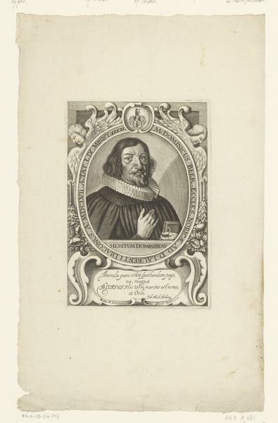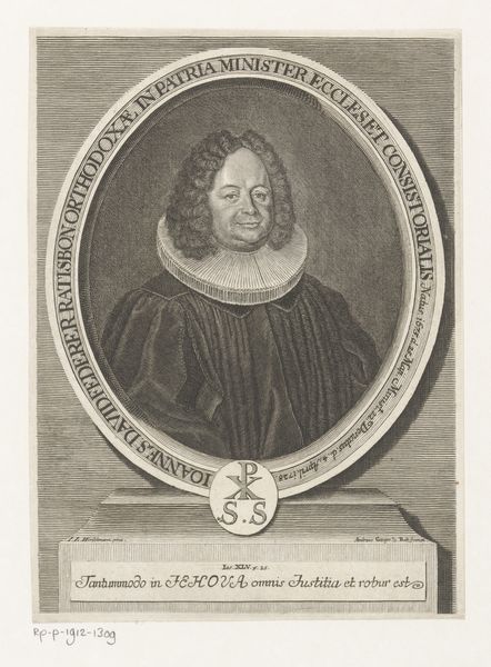 This engraving of Johann Ulrich Meurer was made by Leonhard Heckenauer around 1700. The portrait captures Meurer encircled by an ornate, oval frame filled with symbolic emblems and Latin inscriptions. The entire composition is a study in contrasts, isn't it? The rigid, formal structure of the portrait contrasts with the flowing, organic details of the surrounding ornamentation. Meurer's stern, direct gaze is softened by the delicate lace of his collar. The emblems, each a small vignette, offer a semiotic system of signs, don't they? The architecture, celestial bodies, and landscapes suggest Meurer's engagement with knowledge, spirituality, and the world. The Latin inscriptions add another layer of meaning, framing the image with historical and intellectual context. The detailed linework and careful arrangement of elements speak to a structured way of thinking. It's an era that sought to contain and understand the world through reason and symbolism.