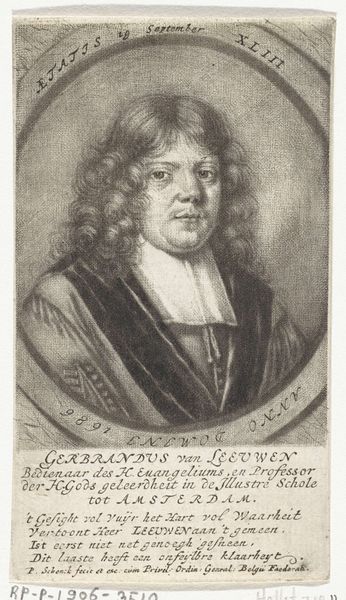 Pieter Schenk created this print of Gerbrand van Leeuwen in Amsterdam. During this period, the Dutch Republic was a hub of intellectual and artistic innovation, but also deeply shaped by its colonial activities and the attendant social hierarchies. Van Leeuwen, a pastor, doctor and professor, is presented here within the visual language of power and respectability, his identity carefully constructed through attire and pose. The text accompanying the portrait makes reference to Sampson, suggesting the ways in which religious and classical narratives were employed to frame individual identity and social standing. Schenk, as the printmaker, played a crucial role in disseminating images and ideas, contributing to the construction of public figures like Van Leeuwen. Consider how the circulation of such images reinforced certain ideals while marginalizing others. How do these historical representations shape our understanding of identity and power today?