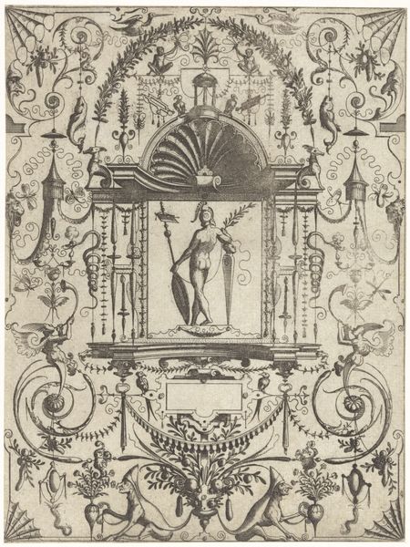 Johannes van Doetecum I created this engraving, "Surface Decoration, Grotesque with Strapwork", sometime in the late 16th century. The elaborate composition, teeming with figures and motifs, presents a world of complex visual interplay. The artist masterfully employs line and form to create a balanced, yet dynamic architecture of decoration. Van Doetecum’s design, with its layered structure and use of grotesque figures, reflects a Mannerist sensibility. The depiction of the Laocoon at the center, framed by representations of Christian virtues, suggests a dialogue between classical antiquity and Christian morality. This tension, rendered in precise detail, invites us to consider the co-existence of disparate cultural and philosophical traditions. Ultimately, the print destabilizes any singular interpretation. Instead, it functions as an elaborate game of signs, encouraging viewers to find their own meaning within its intricate framework. This playful ambiguity is perhaps the most compelling aspect of Van Doetecum's design.