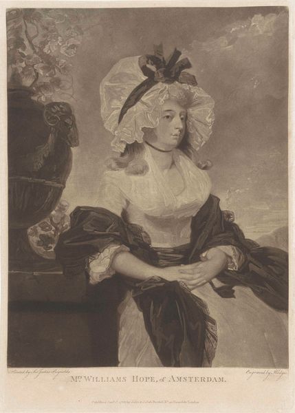 Editor: Here we have Robert Dunkarton’s engraving "Mary Horneck," made in 1778. The monochrome shades create such a pensive, gentle mood. The turban feels quite exotic for the time, I wonder what kind of social statement this image makes? What do you see in this piece? Curator: The “statement,” as you call it, is multifaceted. The orientalist trend in 18th-century portraiture signaled a specific engagement with empire and trade. Portraits such as this one presented British subjects, often women, adorned in “exotic” costumes, embodying the nation’s global reach and, in many ways, a claim to cultural dominance. Does it seem to you that her gaze confronts or invites the viewer? Editor: I see both! Her expression seems knowing, challenging. Perhaps it's projecting an air of cosmopolitanism through her dress? A suggestion of worldliness and access to a broader culture? Curator: Exactly! That is likely intended and also part of its complexity. Consider the socio-political context of displaying “exotic” finery. It was a form of conspicuous consumption – signaling wealth and taste – but also contributing to constructing a British identity that defined itself in relation to an increasingly globalized world. Do you feel this image, as a reproduction, democratizes or perpetuates those ideas? Editor: That's a great point! The fact that it is a print allows for wider circulation, potentially making these symbols of status more accessible. At the same time, it could just reinforce the exclusivity, reminding people of what they *don't* have. Curator: Precisely. Understanding how these images function within their historical moment reveals art as a powerful agent in negotiating cultural values and solidifying power structures. It is more than just a portrait; it’s a commentary on Britain's place in the world. Editor: Thanks! It’s helpful to think of it less as just an image of someone and more about its role within society and politics. It enriches the experience so much more.