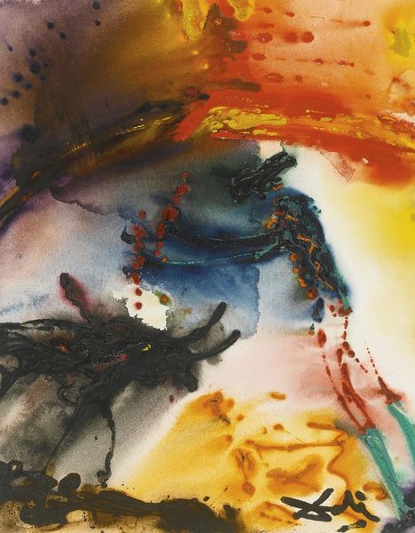 Curator: This is Salvador Dali's "Sol e Sombra," a watercolor from 1968. It embodies the artist's surrealist exploration of Spanish themes. What's your initial reaction? Editor: Violent! The raw slashes of paint and contrasting light and shadow create immediate tension. The bull, in particular, seems furious, almost exploding off the canvas. Curator: That visual drama taps into Spain’s contentious historical relationship with bullfighting, deeply embedded in its culture and politics. Dalí, as a Spaniard, often grappled with this in his art. Editor: Absolutely. The matador figure seems almost ethereal, caught between vibrant life—represented by the rainbow arc—and the raw, instinctual force of the bull, embodying a ritualistic dance between light and darkness, life and death. Curator: And, from a socio-political perspective, think about the late 60s in Spain. The Franco regime was still in power, a period marked by both economic modernization and significant repression. Dali's interest in Spanish cultural icons—the bullfight in this case—occurred at a moment when debates about national identity were taking center stage. Editor: The composition, with the dark, earthy tones at the bottom contrasting the brighter colors above, is compelling. This arrangement enhances the symbolic tension between the grounded reality of the bull and the more spiritual or aspirational realm of the arc above. It resonates with a broader symbolic reading of overcoming one’s animal nature. Curator: I think what stands out for me is Dalí using such fluid, almost accidental watercolor techniques for a subject loaded with history and tradition. It reveals a fresh way of seeing established icons. It seems to ask questions more than make statements. Editor: Agreed. I was stuck by its expressive visual symbols that reach back through time. This isn’t just a bullfight, but a potent metaphor for existential struggle, mirrored, perhaps, in the socio-political realities of Spain at the time it was created. Curator: Considering Dali's iconic status and his tendency for dramatic self-presentation, this image and his return to these cultural themes contributes to an important visual language within Spanish art history. Editor: Exactly! And reflecting on the iconographic depth—"Sol e Sombra" encapsulates so much of that cultural memory, it is so simple but visually rich in metaphoric texture.