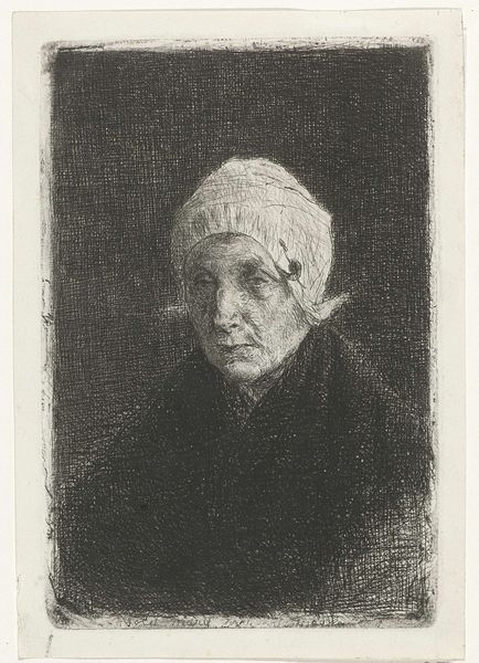 Editor: Here we have Vincent van Gogh's "Head of a Peasant Woman with Dark Cap" from 1885, rendered in oil paint. I find myself immediately drawn to the subject's expression; there's a weariness there, but also a quiet strength. What strikes you most about this work? Curator: Oh, she’s haunting, isn't she? To me, this isn’t just a portrait; it's a glimpse into Van Gogh's own search for truth, that gritty reality he was so determined to capture. You see how the light struggles to find her face, almost as if he’s battling the darkness alongside her? The brushstrokes themselves are like little acts of defiance. What do you make of the earthy tones he's used? Editor: They definitely evoke a sense of hardship, almost like she's made of the earth itself. I can see that. I guess I always associated Van Gogh with his later, more vibrant works; this feels quite different, more somber. Curator: Exactly! This is pre-sunflower Van Gogh, a Van Gogh wrestling with the harsh realities of peasant life in Nuenen. He’s not just painting what he sees, he's painting what he *feels*. He admired these people, their connection to the land, their unvarnished existence. Do you think that comes across? Editor: Absolutely. There's a raw honesty to it that's impossible to ignore. It really challenges the romantic notions I had about his work and moves away from those Impressionist paintings to something real. Curator: Yes, and perhaps reminds us that beauty can be found even in the darkest corners, and that art, at its best, is a form of empathy. This piece continues to move me; it’s a reminder that art is also a journey. Editor: I agree, thank you!