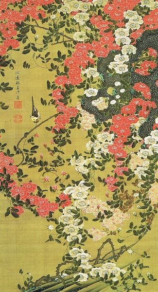 Curator: I'm immediately drawn to the simplified yet powerful arrangement of these hanging blue blossoms—almost heavy with the promise of fragrance. What a gorgeous design! Editor: Indeed. This painting is called "Wisteria," dating from 1909 to 1910 by Kamisaka Sekka, showcasing a striking arrangement of colors in the style of traditional Asian art. Curator: Considering Sekka’s background, its position within the cultural shifts happening at the time becomes more clear. Japan was at a crossroads grappling with Westernization, and Sekka, among others, were actively looking to revitalize Japanese artistic identity. The emphasis on traditional aesthetics through print and design elevated "craft" to fine art status. Editor: It’s not merely aesthetic. I agree that the piece resists Westernization. Yet beyond an expression of identity, how does it interact with societal hierarchies or power dynamics of the time? What specific labor went into producing this piece, and how was Sekka positioned relative to other artisans or producers? Curator: A valid consideration! During the Meiji era, there was an explicit interest in national branding that leaned on idealized representations of nature—of women, of tradition. So you can’t consider this imagery outside the context of power—what is allowed to be seen, what gets deemed traditionally "Japanese." Editor: The pattern is very beautiful—clearly a deliberate design. So tell me more about that! Is it a painting on paper? Curator: Indeed, Sekka experimented with printing techniques. These allowed for a flattened, patterned surface that diverges quite strongly from conventional three-dimensional Western painting practices. The tension of these surfaces creates unique possibilities and challenges—but they’re choices deeply influenced by the cultural pressures I was discussing. Editor: Thanks! By using specific materials and applying a decorative treatment, the artist engaged both social expectation and aesthetic desire. Curator: So, perhaps Sekka's intention was to push back against the rigid definition of roles during an era of great cultural shift! I have to say, considering how many interpretations this artwork lends itself to, it remains stunning in both impact and execution. Editor: Absolutely. We can appreciate its visual impact today, but equally assess the modes and methods through which this visual statement came to exist!