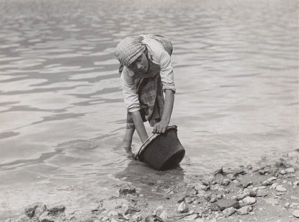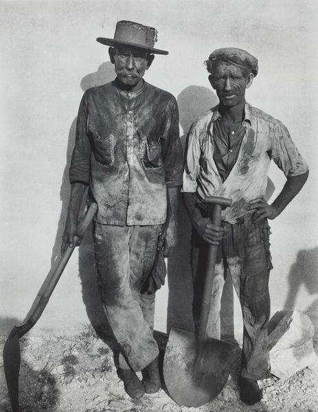 Editor: This is "Man with Sombrero, Mexico" a photograph taken by Paul Strand in 1933. It has such a sense of intimacy, yet there is also a powerful social message in the pose and presentation. What symbols or meanings do you find most compelling in this work? Curator: The sombrero itself is immediately evocative. Beyond simply sun protection, it carries within it generations of cultural identity and social history. Notice how it dominates the frame, eclipsing the man's face. What emotional effect does that create for you? Editor: It makes him anonymous, in a way. The hat becomes the symbol, and the individual almost disappears. Curator: Precisely! The obscuring of the face speaks volumes about cultural roles. Strand was deeply interested in capturing what he considered the soul of a people. What do you think he aimed to express with such potent symbols? Consider the political backdrop of post-revolutionary Mexico and the rise of indigenismo. Editor: I guess he was trying to highlight the struggles and dignity of ordinary Mexicans. The bare feet on the rough ground add to that feeling. It feels raw and authentic. Curator: Exactly. It strips away any romantic notions, and highlights a certain resilience. It's a very grounded image. It's fascinating how seemingly simple choices in composition and focus can generate such complex narratives, linking the personal with collective experience, don't you agree? Editor: Yes, definitely. Seeing it through the lens of cultural symbols really opens up a deeper understanding of Strand’s work. It is so much more than just a portrait. Curator: Indeed. Recognizing the enduring power of symbols unlocks layers of cultural memory contained within the photograph.