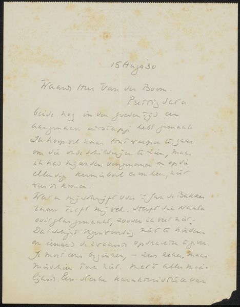 Curator: Before us is a drawing entitled "Brief aan A. van der Boom" by Richard Nicolaüs Roland Holst, likely created between 1934 and 1939. It resides here at the Rijksmuseum. Editor: It looks so fragile. The aged paper and delicate handwriting give it a very personal, intimate feeling. You almost feel as though you’re intruding on something private. Curator: Absolutely. As a material object, it's fascinating. Notice the ink; the texture on the paper's surface created subtle variations in line weight, which imbues it with a certain expressiveness despite its apparent simplicity. And paper was not only a surface here; its qualities of being able to easily transmit these intimate communications played a significant part. Editor: This also makes me consider who A. van der Boom was, and what role they occupied in Holst's life that he chose this method of communication. I’m wondering about their relationship. Was this a simple note, or part of a deeper exchange occurring during turbulent times? We have the date and should research it; what's revealed can further reveal societal relationships during that period. Curator: Perhaps. Looking at the handwritten text itself, we are looking at an archive in its most raw state, bearing an immediate link between production of mind and production of labor. The letter isn't printed; we are looking directly into a system of creating messages through bodily actions. And the materials of its making would have been common, available… utilitarian. Editor: But I see that “utilitarian” is layered with other meaning as the context deepens; I agree! This is especially resonant in the shadow of impending war. Personal communication became critical for solidarity, to organize and encourage continued cultural growth among like minds. It makes you think about the act of writing as an assertion of agency under social tension. Curator: Precisely! In analyzing Roland Holst's work here, we gain not only insights into artistic process or intentions, but also into production systems inherent to creative production within society itself. Editor: For me, it emphasizes art's power not as a detached aesthetic experience, but as embedded, lived realities shaping individual and collective fates. Curator: Indeed. A simple note, yet such rich and overlapping materials. Editor: Exactly—layers waiting for audiences to read between these historic lines.