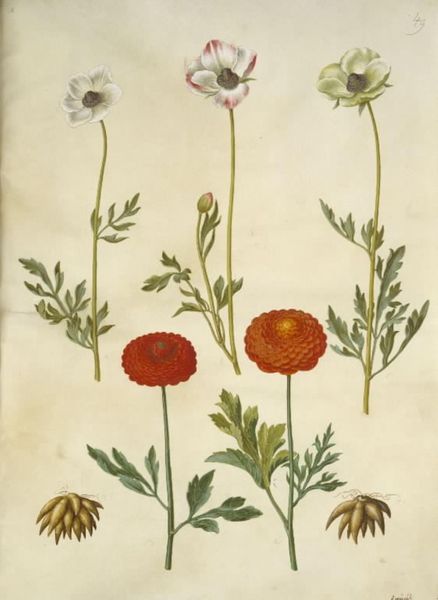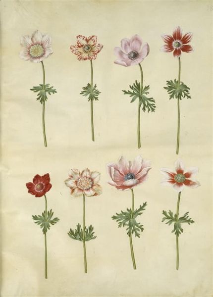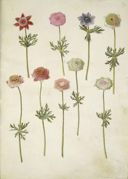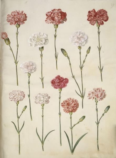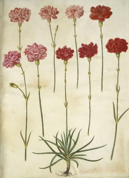 Hans Simon Holtzbecker rendered this image of Dianthus caryophyllus, or carnations, with watercolor on parchment. The composition arranges twelve carnations of varying shades and states of bloom in a grid. This regimented order creates a visual rhythm. Each flower is meticulously depicted, showcasing Holtzbecker's masterful rendering of form and texture. The color palette is dominated by shades of pink and red, which lends a delicate, almost ethereal quality to the work. The grid-like composition nods to scientific classification, organizing nature into a structured taxonomy. Holtzbecker uses the formal structure of the grid to explore our impulse to organize and classify the natural world. The effect is one of both scientific precision and aesthetic appreciation. Note the rendering of the flowers themselves. How do their varying forms, colors, and textures work to simultaneously create harmony and individuation within the broader composition? The subtle differences in each flower's form and color invite us to consider themes of variation and identity.