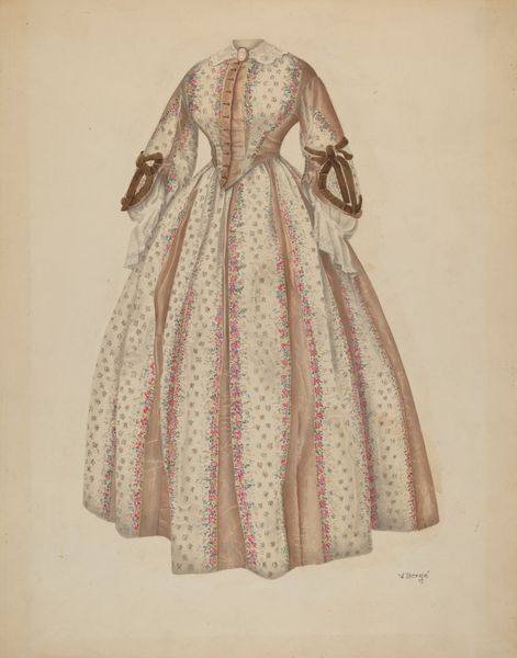 Curator: This engaging work before us is "Doll - 'Ann Blairs'," dating to around 1936, created by Mary E. Humes using watercolor and drawing techniques. Editor: Immediately, there's an unsettling quality here. That direct, almost accusing gaze and rigid posture suggest more than a simple childhood plaything. It feels loaded, even confrontational. Curator: The doll's representation offers a fascinating intersection of childhood and societal expectations. Consider the carefully rendered dress and delicate features versus the unnervingly stiff presentation. What dialogues might arise concerning gender performance and imposed roles for young women within that specific era? Editor: And the brown segmented arms, almost detached—they suggest ideas about brokenness, repair, perhaps the fragmented self within a patriarchal society? Furthermore, are the rosiness of the cheeks intended to imply youthfulness, or is there a violence there in their stark artificiality? Curator: Humes' choice to portray the doll with such detail demands attention to its socio-cultural place. Dolls are rarely just toys; they become vehicles for instruction and aspiration. Her somewhat simplified aesthetic and stark representation invites critical examination on how these expectations get embedded early in childhood. The artwork also presents an avenue for a more intersectional exploration on issues related to women. Editor: Absolutely. It speaks to the doll's existence within a capitalist society—objects burdened by assigned significance. And let’s remember how museums like this one shape the stories we tell around these artifacts, and the messages about beauty or behavior they subtly endorse. Is there any record about Mary Humes that help us ground the origin or context of her rendering of this particular doll? Curator: Details surrounding the artist are scant, unfortunately, making her intentions open to interpretations framed within these theoretical paradigms. In essence, the ambiguity contributes to its enduring capacity for inspiring dialog and reflection. Editor: Well, looking closer, the stark contrast makes me reassess its sense of vulnerability—perhaps not accusation, but a plea for visibility, which also offers a fresh way of exploring objectification within art and wider societal framework. Curator: Indeed. These shifts in perception highlight art’s active participation within the cultural milieu, serving not merely as record, but provocation and hopefully progress.
