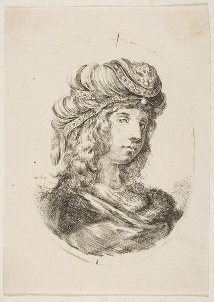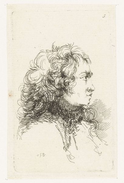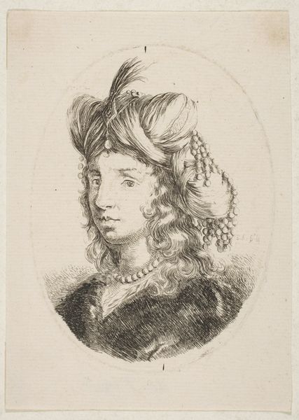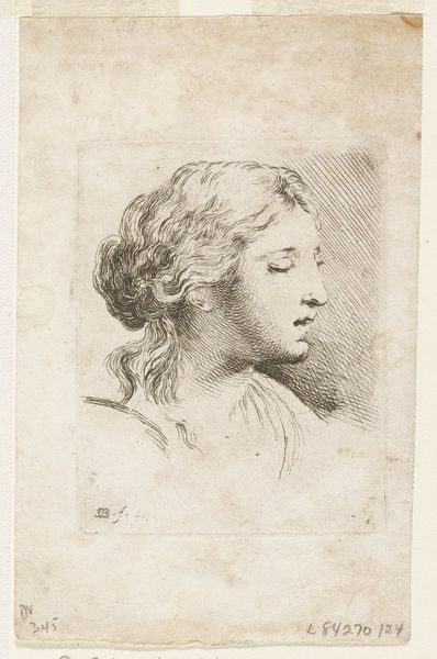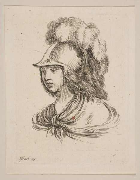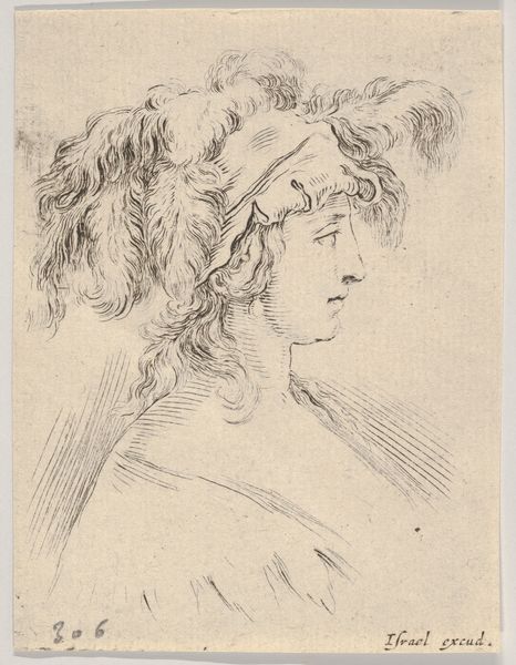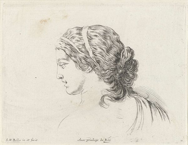 This is Plate 15, a mid-bust drawing of a young woman in profile, made by Stefano della Bella as part of ‘The Book for Learning to Draw’. Created during a time of rigid social hierarchies, such images served as tools for artists and amateurs to learn the established styles of portraiture, reinforcing notions of beauty and status. This idealized representation reflects the period’s fascination with classical forms, yet it also subtly encodes the subject's social standing through her refined features and elaborate attire. Consider the role of women in the 17th century, often confined to domestic roles, their identities closely tied to appearance and decorum. This drawing, while seemingly a simple study, participates in the construction of femininity, offering both an aspirational image and a set of standards to emulate. The delicate lines and focus on ornamentation invite us to contemplate the complex interplay between art, identity, and social expectation.