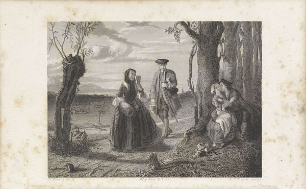 Curator: Look at this etching; it's "Boeren in gesprek," or "Farmers Conversing." Made sometime between 1779 and 1793 by Marten J. Waefelaers, a printmaker active in the late 18th century. He captured a quiet rural scene through the precise art of engraving. Editor: There's a beautiful, melancholic feel here. The tones are all grays, suggesting an overcast day maybe, and the figures appear so deeply caught in their moment that they seem totally unaware they’re being observed. Curator: Well, that's characteristic of genre painting at that time; these prints offered glimpses into the lives of ordinary people. Waefelaers likely sought to portray a scene of authentic rural life, perhaps with a touch of social commentary, if one looks at similar pieces produced during that era. Notice the careful depiction of labour alongside themes of local community life. Editor: It's like eavesdropping on a private moment. The composition places us right in their world, but slightly removed as viewers. There's something timeless in that. Even the scratchy, almost unfinished style adds to the sensation that time is still passing in that scene. Curator: Yes, and the choice of printmaking also means the work was meant for wider distribution beyond aristocratic or courtly circles. This brought depictions of peasant life to more households. In that time of political tension in the Netherlands and Europe, images of country life are idealized and seen as free from political conflict. Editor: Looking at that fellow with the shovel, though, there's a solidity that feels very present. Is he tired, happy to stop, thinking of a drink after work? The image offers little but demands so much speculation of what that little conversation is actually about. It’s more of an atmosphere than a narrative, and isn't that perfect in its own way? Curator: I agree! By showcasing the common person, Waefelaers' work is more than just art; it acts as a social mirror. It asks viewers what meaning they assign to representations of farmers in Dutch society. Editor: Ultimately, whether capturing simple realism or constructing idealized fiction, it's a poignant observation of human interaction. It feels almost too subtle, perhaps too familiar, to not linger with a moment or two longer.