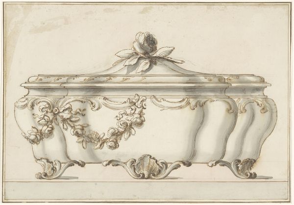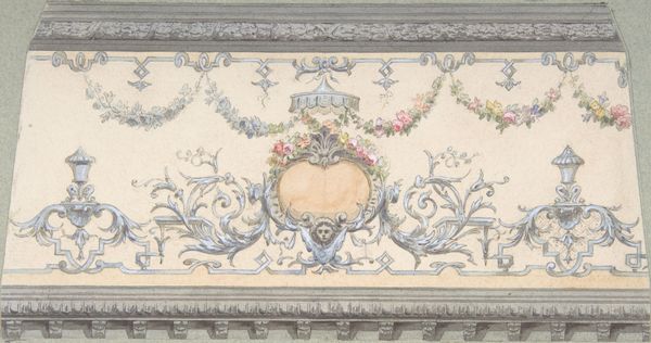 Curator: Take a moment to gaze upwards at "Design for a ceiling with two putti and symbols for the arts," a watercolor drawing from between 1850 and 1900 by Jules-Edmond-Charles Lachaise, now residing at The Met. The pastel hues give the artwork a peaceful feeling. What stands out to you most when you look at it? Editor: The precision of the draftsmanship juxtaposed with the fluidity of the watercolor. I can almost smell the pigment drying on the page, feel the grain of the paper under the artist's hand. Curator: Precisely! Lachaise’s technique highlights the interplay between line and wash, and in the lower frieze, we have carefully rendered putti framed by meticulously detailed scrolling ornaments and classical motifs. Notice the balanced symmetry and classical composition! Editor: That's all well and good but how did he transfer that idea onto a vaulted ceiling, transforming the delicate lines into something larger? What kind of artisans collaborated on this, and how much did it cost? These things matter more than just observing “symmetry.” Curator: The design embodies neoclassical ideals: harmony, order, and a celebration of artistic and intellectual pursuits. Consider the allegorical representations: palettes, musical instruments, and books interwoven into the composition, signifying different artistic disciplines. They form a vocabulary understandable in many contexts. Editor: And, like you, those elite contexts often erase the unseen labour involved: the production of paints, the preparation of surfaces. Without considering that labour, it becomes yet another example of 19th century overconsumption. What looks delicate is embedded in global supply chains. Curator: Well, looking closer at the composition of these putti, observe the dynamism infused by their gestures and interaction with symbols, injecting vitality within a classical framework. The composition has undeniable rhythm and balance. Editor: Yes, but let's consider where those materials originated! Lachaise probably didn’t prepare his own watercolors or refine his own paper. Who produced these things, and what were their working conditions? What about the structures that enabled the work itself? These are the truly interesting structural considerations! Curator: While you focus on the macro-level processes, the design's delicate balance offers a compelling glimpse into how classical elements adapted and endured throughout the nineteenth century in service of a well composed picture. Editor: And from that balance emerges new considerations. With this artwork, Lachaise not only encapsulates a moment in art history, but also leaves space to ask questions about our relationship to resources.
