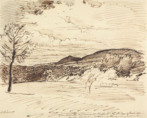 Editor: This is "View at Mr. Sheppard's, The Ridge, Gloucestershire" by John Linnell, and it appears to be a pen and pencil drawing. It's very subtle in its tones, almost monochromatic, and it makes me think about the relationship between landscape art and documentation. What do you see in this piece that connects to its historical moment? Curator: Well, what's particularly interesting is the apparent casualness. It is a landscape, of course, and landscape painting and drawing was increasingly popular, seen as a powerful tool for national identity. Do you notice anything about the implied viewpoint of the artist? Editor: It's sort of an elevated view. It feels like we’re standing slightly above the landscape, looking down onto it. Is that relevant? Curator: Precisely. This 'commanding view' was a familiar strategy in landscape art and one which spoke to prevailing social hierarchies. Land ownership, national pride – those kinds of concepts. But notice the apparent spontaneity and unfinished nature. While it shares the same subject matter as some grander landscape paintings of the time, its effect is more intimate. Does it suggest that landscape is available to everybody, or only the privilege of few? Editor: It seems less idealized and more personal, maybe even accessible. Almost like a travel sketch, less about glorifying the land and more about a fleeting experience of being in it. Curator: Exactly! This could signal a shift towards a democratization of landscape art and the romantic vision, aligning it with individual experience rather than nationalistic ideals. It is like he is opening up that experience. Editor: That’s really interesting. I hadn't considered how even a simple sketch could carry those kinds of cultural implications. I’ll definitely look at landscapes differently now.