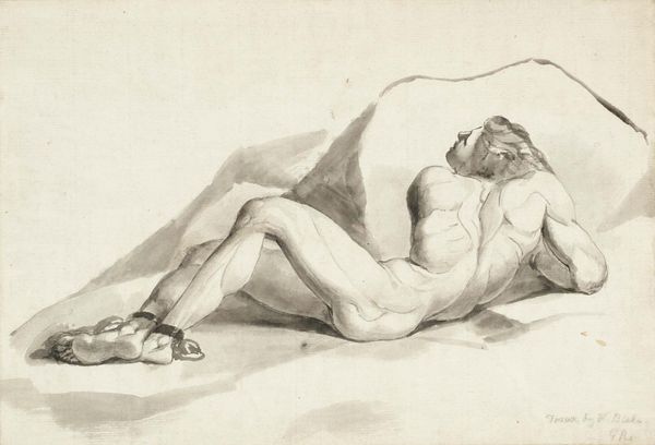 Editor: Here we have "Liggend mannelijk naakt, met arm achter het hoofd," a pencil drawing by Daniël Vrijdag from 1792 or 1793. It depicts a reclining nude male figure. The rendering is so smooth. How would you interpret this drawing? Curator: This work exists within a historical context profoundly shaped by the male gaze and the objectification of the male body, often under the guise of academic study. Consider how notions of masculinity were being constructed during the late 18th century. Are we simply looking at an objective study of anatomy, or is something more complex at play? Editor: That’s interesting. It does seem objective at first glance. Almost like a medical illustration. But his pose seems kind of…vulnerable? Curator: Precisely! Where does this vulnerability sit within the dominant patriarchal structures of the time? Remember that this was produced during the Age of Enlightenment. Is there an implied power dynamic between the artist, the viewer, and the subject? Does that context change our perception of the piece? Editor: It definitely makes me question my own assumptions. I hadn't considered that the artistic gaze might be a manifestation of control and reinforces traditional social roles. I was thinking this was "just" academic art, but it’s way more complex than that! Curator: Indeed. By engaging with art through an intersectional lens, we reveal deeper dialogues about gender, power, and representation that are woven into the fabric of art history. What initially seems like a straightforward depiction, then, holds the capacity to confront uncomfortable truths. Editor: I'll never look at another nude figure the same way again. I think I finally grasp the meaning and importance of "context"! Curator: It's about recognising how historical and societal forces are embedded in artistic creations and inform our interpretation of the work. Seeing these layers can be a source of empowerment for the viewer and for ourselves.