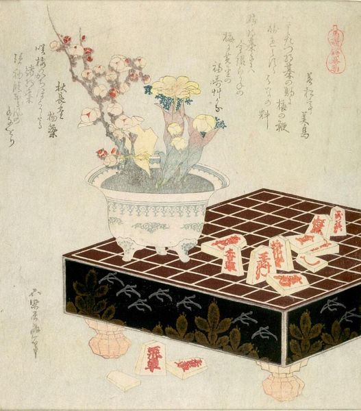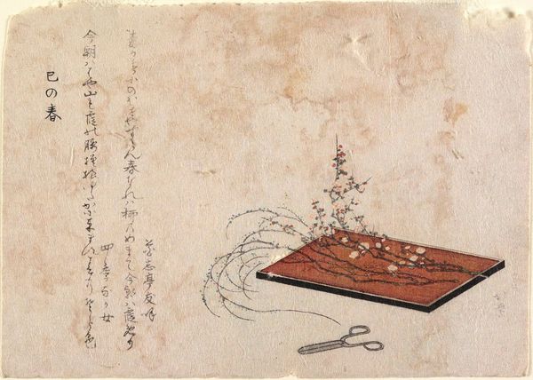 Editor: This is Kitao Shigemasa’s “Cards and Fukujusō Flower.” I’m struck by the delicate arrangement and subdued palette. What stories do you think this little collection of objects whispers? Curator: Oh, it murmurs of quiet rituals, doesn't it? I see a fleeting moment captured, a pause in the day. Perhaps the artist, Shigemasa, was contemplating the transient beauty of life, symbolized by the Fukujusō – a flower associated with good fortune. The cards scattered about, like fallen leaves, hint at social connections, maybe even secrets shared. Do you feel that sense of intimacy too? Editor: I do now! The untied ribbons and scattered cards suggest a life unfolding, not perfectly arranged. Curator: Exactly! It's a gentle reminder that beauty often lies in the imperfect. A little meditation from 18th-century Japan. Makes you wonder about the sender and receiver, doesn't it? Editor: Absolutely. Now I feel like writing a letter... or maybe just arranging some flowers.