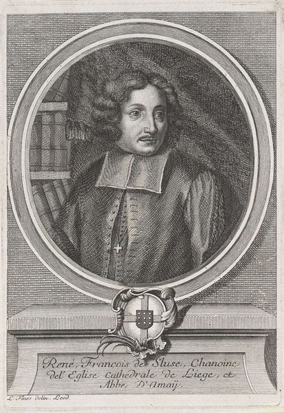 Curator: This is a portrait of Giovanni Francesco Raimondi. It’s an engraving, dating probably somewhere between 1654 and 1679 and crafted by Albertus Clouwet. Editor: It’s striking how the detail gives it almost a photographic quality, despite being an engraving. There's a somber feel; his expression seems serious, almost melancholy. Curator: The piece situates itself within a tradition of portraiture aimed at immortalizing notable figures. Raimondi, whose age is indicated as fifty in the inscription, held a position of some standing within his community, a role that Clouwet immortalized through meticulous detail and skillful use of line. Editor: Yes, the linear detail—it's incredibly precise! The texture in the hair, the shading around the eyes, the subtle folds in his clothing—it's quite compelling. There is so much labor visible here that creates a striking image of power. Do you see that cross above the text, and what appears to be coat-of-arms in each top corner? Those details denote rank in ways that suggest we must interrogate not only what this work of art appears to signify at face value but also, the undergirding it relies upon in terms of material and cultural power. Curator: The coats of arms likely connect to Raimondi’s lineage or affiliation, solidifying his societal standing through established symbols. The baroque love for the grand, but the somberness may come from its function, marking legacy, perhaps even after someone passed. These are pieces often intended for the gaze of those already in the in-group. Editor: So, in thinking about who this artwork represents, and who it likely represents to, are there interventions that contemporary practitioners could initiate today, using these archives of symbolic authority? What alternative visions or narratives could disrupt this canon? Curator: The art world continuously grapples with these historical representations. Through exhibiting these pieces, juxtaposing them with contemporary art, museums invite conversations, not just about the art itself, but the narrative and legacies it reflects. We encourage questions regarding class, social mobility, political history. Editor: It invites viewers to contemplate who is missing from this visual archive and to understand the nuanced dance between historical record, artistic expression, and the ongoing struggle for representational justice. Curator: Precisely, a reflection on how imagery and art participates in historical construction, memory, and identity.