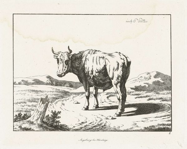 This print, "Staaende Koe, van achter gezien" from the Rijksmuseum, presents a cow seen from behind, rendered in delicate lines and subtle shading. The composition is divided into three distinct horizontal bands: the foreground with tufts of grass and rocks, the cow which dominates the centre, and a background with low hills and a distant tree. The image uses the structure of the landscape to frame the animal, creating a sense of depth. The artist's choice to depict the cow from this angle shifts our focus from its face to its mass and form. The rendering is more than just an objective recording; it explores the cow's texture and volume through line and tone. This invites a deeper consideration of what it means to represent an animal, and the interplay between natural form and artistic representation. The print reflects broader artistic and philosophical questions of its time, using form to engage with perception, representation, and the natural world. It presents a dialogue between artistic skill and the inherent structure of the subject itself.