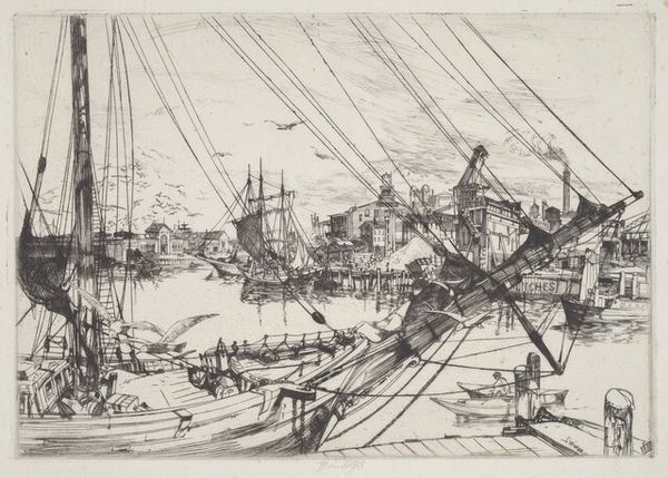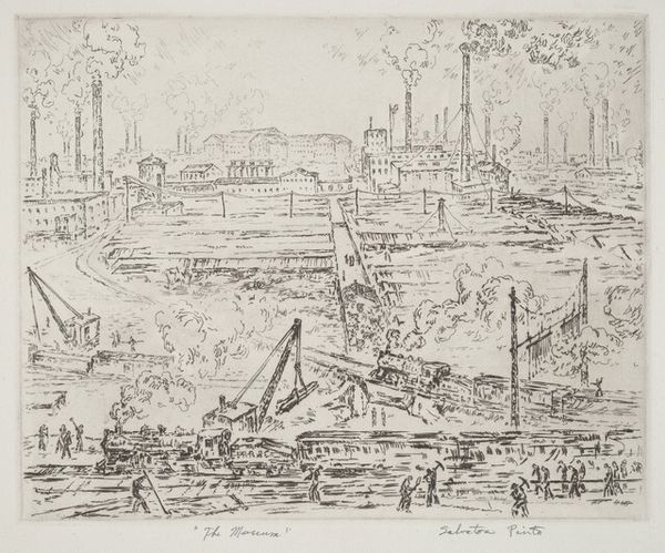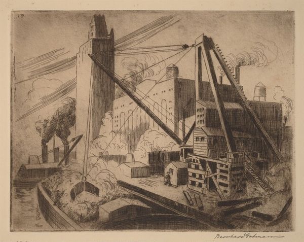Salvatore Pinto created this etching entitled "The Steel Bucket." It’s reminiscent of the urban industrial scenes celebrated by the Precisionist movement. The heroic depiction of the modern city, a dominant theme in the art of the interwar period, seems apparent in the artist's use of linear perspective, which draws the eye to the background, framing the industrial scene with a skyline of soaring towers. But it's the figures toiling in the foreground that complicate the narrative. The figures seem diminished by their surroundings, suggesting a tension between the promise of progress and its human cost. To truly understand Pinto's statement, we would need to know the context of its making, perhaps by researching exhibition records, reviews, and the artist's own writings, if they exist. This process of historical investigation helps us move beyond the surface and understand the deeper meanings embedded in the art of the past.
