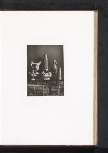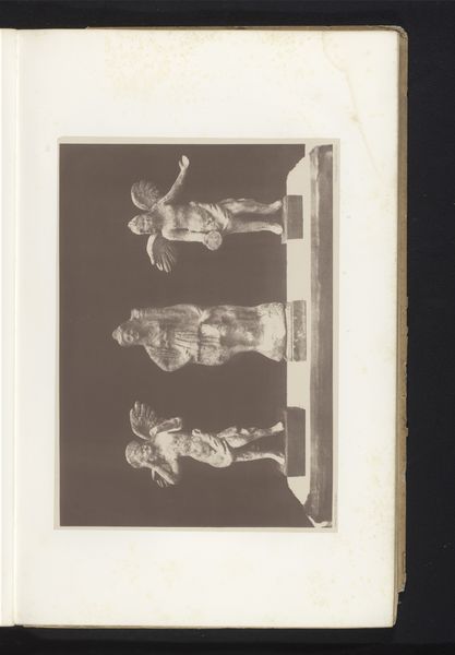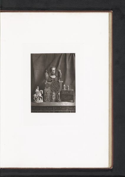 Editor: Here we have a photograph from 1873 titled "Buste van Michelangelo, opgesteld tijdens de Exposition Rétrospective van 1873 in Tours, Frankrijk." It seems to be a bronze bust of Michelangelo. There is a formality and almost gravity to the presentation. What stands out to you in this piece? Curator: It's fascinating how this photograph captures not just a bust of Michelangelo, but also a moment in the history of art reception itself. These expositions were powerful tools for shaping public opinion on artists and artistic movements. This image documents an early attempt to solidify Michelangelo's place in the canon. Notice the solemn staging - how does this specific setting reinforce certain interpretations and downplay others? Editor: It does feel like a very deliberate attempt at immortalizing him. Almost a way of controlling the narrative around his legacy. Was photography often used this way, to document and almost legitimize exhibitions? Curator: Absolutely. Photography played a key role in democratizing art to some degree, making it more accessible to broader audiences, yet it also helped institutionalize particular narratives about art and its history. Consider how the photographer chooses to frame this object. Is it presented as a purely artistic creation, or also as a historical artifact? Editor: It’s both, I think, presented reverently. The choice of bronze, even photographed, lends a timelessness. Did these exhibitions typically focus on solidifying "masters" of the past, or did they champion new and emerging artists as well? Curator: Often both, though retrospective exhibitions like this were certainly instrumental in constructing the very notion of a "master" in the first place. Thinking about it this way, perhaps the "Buste van Michelangelo" isn't merely a portrait of a man but rather, the embodiment of artistic genius as conceived by a specific historical period. Editor: That’s a really interesting perspective. I hadn't considered how much these events, and the images they produced, actively shaped our understanding of art history. It definitely reframes the photograph for me. Curator: Exactly, we shape art, but also art shapes us. Thank you.