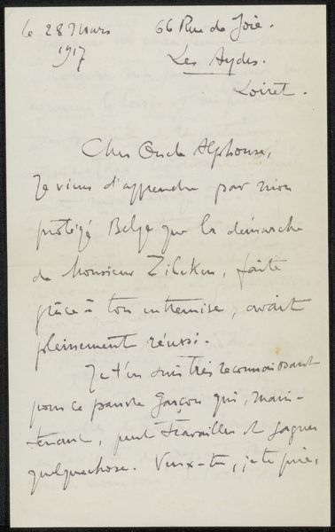 Curator: This work, titled "Brief aan Philip Zilcken," was created by Fernand Khnopff in 1915. It's executed in ink on paper. Editor: At first glance, the handwriting presents a formal tone; however, I'm curious about what feelings might be communicated to a fellow artist using such conventional structure. Curator: We see the conventions of letter-writing at play, reflecting a specific set of social rituals governing correspondence within artistic and intellectual circles. Its very existence tells us about art production and communication in that period, revealing networks of patronage and influence. Editor: From a formal standpoint, the composition emphasizes linearity— the steady descent of the ink forming columns on a page, all framed by negative space. Even without understanding the language, a clear hierarchy unfolds. The graceful script that gradually becomes bolder and more assertive with Khnopff's distinct signature gives an intimate tone and visual grounding. Curator: Absolutely. The materials—paper, ink, and pen—represent the basic tools of artistic exchange at that time. Furthermore, such intimate letter form embodies a symbolic move towards preserving privacy, accessibility and immediate utility, unlike monumental or public art commissions. Editor: Despite the letter’s utilitarian intent, the flourishes in the handwriting and carefully placed text demonstrate an attentiveness to aesthetic refinement that goes beyond mere functionality. Khnopff seems very conscious of visual artistry. Curator: Consider that he’s corresponding with Zilcken—himself an artist and critic. Khnopff subtly engages the formal expectations within this dynamic of sender and recipient. What does he say through the deliberate artistic construction? Editor: The elegant curves and the deliberate spacing create visual pleasure; therefore, in observing an intimate letter to an fellow artist, one grasps a moment, an exchange frozen by gesture of the ink. Curator: This glimpse of artistic process allows us a certain intimacy otherwise hidden, it reveals something essential about this artist.