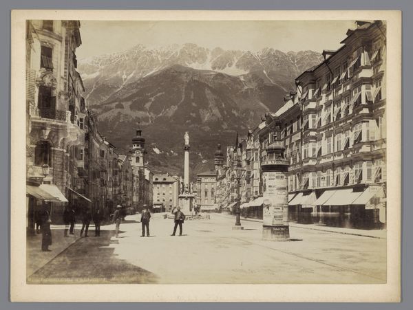 Curator: This gelatin silver print, “Gezicht op de Burggraben en de Hofkerk in Innsbruck, Oostenrijk”, presents a cityscape captured sometime between 1850 and 1920, likely by Fritz Gratl. Editor: What a beautiful sepia-toned dream. The light feels…old, heavy with history, you know? Like a memory someone is trying to hold onto. Curator: Indeed. Note the composition: The photograph deploys a strong central perspective, drawing the viewer's eye from the bustling street towards the stoic Hofkirche. The verticality of the church's tower offers a striking counterpoint to the horizontal thrust of the streetscape. Editor: Exactly! And the mountains in the background…distant yet looming, like a permanent audience. There is a sense of human presence, all the figures, yet I feel a serene stillness. Almost otherworldly, but yet of earth. Curator: We can appreciate here how the realist and neoclassical artistic movements were applied, with details on buildings carefully rendered in great photographic clarity while its grand scenery is bathed in consistent, even light. Observe how this approach gives dignity to even mundane, architectural details of 19th century Europe, an era obsessed with structural balance and order. Editor: That almost-dreamy effect…it's interesting considering it is supposed to be documenting a “real” place. But this makes me think about the unreliability of memory, and also maybe about our present moment viewed from 100 years in the future, also like looking back on a sepia dream. It is all so heavy and melancholic…but in a comforting way? Curator: Your intuitive response aligns with my analysis. The tonal qualities – the shades and light – contribute heavily to a sense of temporal distance, layering history with subjective experience and thus impacting the piece's interpretation and appreciation. It's neoclassical art through a nostalgic lens, offering insight to its subject. Editor: So, this image becomes more than just a record of a street in Innsbruck; it morphs into a mediation on our place within Time. It will linger within me for days…it’s good food for the soul!