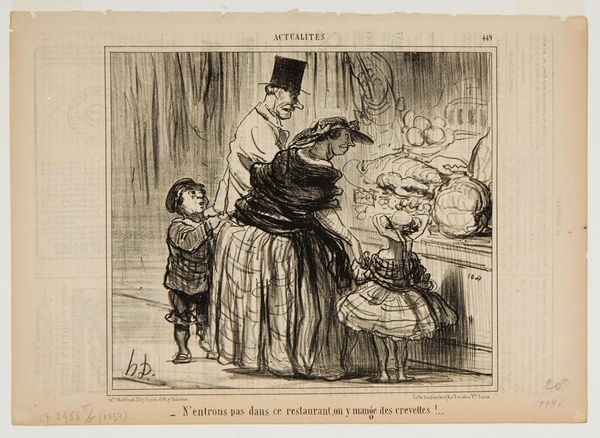 Editor: This lithograph, "Let's not go into this restaurant..." by Honoré Daumier, presents a family pausing before a restaurant window. There’s an immediate sense of unease, a reluctance perhaps. What can you tell me about the context of this piece? Curator: Daumier often used his art as social commentary. This image, like many of his works, likely critiques bourgeois society and their attitudes toward class and consumption. The child’s plea and the parent's hesitation suggest a concern about the restaurant’s offerings – "shrimps!", and perhaps, anxieties about social status and affordability. Editor: So, the "shrimps" are a symbol here? Curator: Exactly. They represent a certain kind of dining experience and the social pressures associated with it. What do you make of the family's expressions? Editor: They seem apprehensive, maybe even disgusted? I hadn't considered it as a statement on social pressures. Curator: Daumier used these everyday scenes to expose larger societal issues. It's a potent blend of art and social activism.