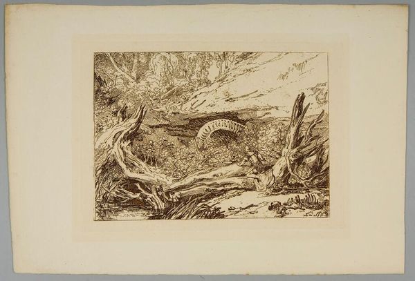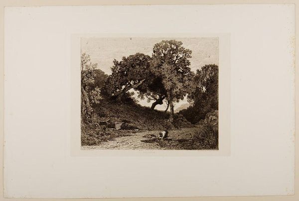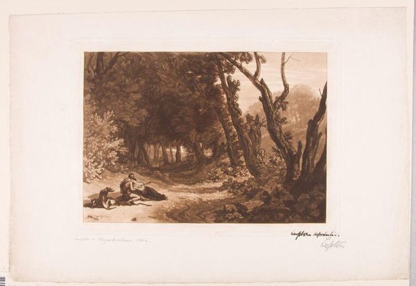Editor: So, this is Thomas Goff Lupton’s "Procris and Cephalus," a sepia print. It's such a delicate scene, but something about the way the figures are placed feels a bit unsettling. What do you see in this piece? Curator: I see a tragic tale of gendered expectations and power. Lupton's rendition of this classical myth highlights the vulnerability of Procris, whose demise stems from Cephalus's mistrust. How does the artist visually reinforce this imbalance, do you think? Editor: Well, Cephalus is centrally located, and Procris looks quite small…almost hidden. Curator: Exactly. Consider how the landscape itself—the forest—becomes a silent witness, complicit in this narrative of male dominance and female silencing. Doesn't it make you consider the broader social structures at play? Editor: It definitely makes me think about it differently, seeing it in that context. Thanks! Curator: My pleasure! It’s a reminder that even seemingly idyllic scenes can reveal deeper societal issues if we examine them critically.