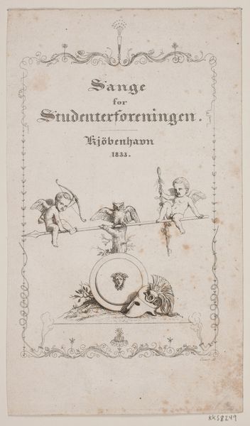 Curator: I’m immediately struck by the delicate and ethereal quality of this image. It has an air of serene elegance, doesn’t it? Editor: Indeed. Let's explore "Venus on a Cloud," a piece created around 1755 by Simon Fokke. This work, residing at the Rijksmuseum, presents us with an engraving rich in both detail and historical context. Curator: The figure of Venus floating on clouds… the cupid aiming an arrow. What might this imagery signify within the book it introduces? It’s so classically evocative. I wonder about the garden the title refers to, what kind of thoughts might be inspired in such a place? Editor: “Tuingedachten,” garden thoughts, invites a socio-historical perspective, particularly when coupled with the classical imagery of Venus. Consider the 18th century, when gardens became important spaces for social gatherings and intellectual discourse. This image, therefore, speaks to the ideals of love, beauty, and philosophical contemplation associated with these cultivated spaces. Curator: I see what you mean. Gardens then were more than just land; they were curated spaces ripe with cultural meaning. It makes you think, why Venus? Perhaps the artist chose her to subtly align garden ideals with classical virtues. Editor: Precisely. And this was all mediated by publishers like Abraham Blussé, connecting intellectual content with a broader reading public through imagery and typography. Fokke's engraving and Blussé's publication aimed to elevate the work's perceived status and encourage engagement among a growing literate class. Curator: I find myself dwelling on that cupid – the messenger of love about to release his arrow. The clouds too suggest transition, a sort of ethereal bridge connecting heaven and earth. It hints at profound emotional and psychological depth hidden beneath that light tone. Editor: An insightful point. By blending classical mythology with contemporary landscapes, Fokke encourages viewers to seek parallels between the past and present, enriching both their understanding and the book's appeal. The choice of that very particular, clean typeface in the title does a great deal, too. Curator: Considering everything, I’d say this image really reflects its period’s cultural ambitions, revealing not only an aesthetic grace but a genuine interest in linking garden philosophy with broader themes of love, society, and human understanding. Editor: Agreed. “Venus on a Cloud” encapsulates the evolving relationship between art, literature, and society, and helps us see the layers of intention that creators infused into even these modest prints for wider distribution.