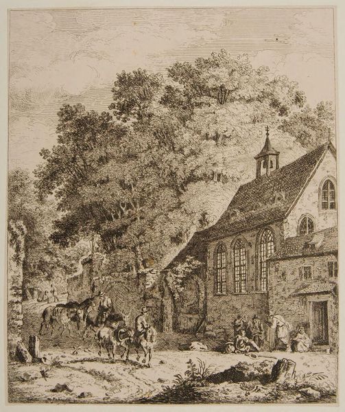 Johannes Elffers created this drawing of the 'Huis te Mettmann, boven Düsseldorf' using pen in gray ink and brush in gray. The subject is a rural scene: a large, aged house, possibly a farmhouse, is the focal point, and two figures appear to be engaged in conversation near the overgrown foliage, suggesting a narrative element within the landscape. This drawing may reflect the broader cultural and institutional history of landscape art in the Netherlands, particularly the Romantic era. The artist's choice to depict this particular setting and the figures within it suggests an interest in the everyday lives of people and the settings they inhabit. As art historians, we can draw upon inventories, estate papers, and other archival sources to flesh out the story that Elffers only hints at. The meaning of this work is contingent on the social and institutional contexts from which it emerged.