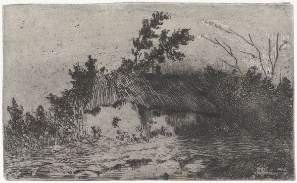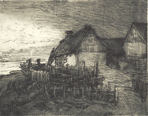This is Vincent van Gogh's Tabernacle in the Heath. The entire composition is constructed around a dark palette. The thatched cottage in the center is anchored by dense, shadowed textures. Look at how Van Gogh uses the formal structure of the building to provide a sense of stability, contrasting with the fluid strokes of the landscape. The windows of the cottage, illuminated from within, act as focal points. They draw the viewer's eye and suggest an interior world, a beacon of domesticity amidst the wildness of the heath. The trees on the right side mirror the vertical lines of the house. The emphasis on light and shadow is not merely descriptive, but rather symbolic. It suggests a tension between shelter and exposure, safety and vulnerability. The artwork uses the formal language of space and light to explore themes of isolation and belonging. The dialogue between these elements invites a continued interpretation of its cultural resonance.