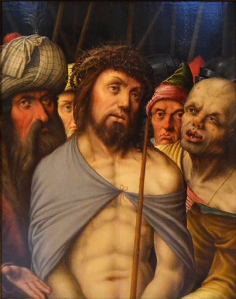 Curator: This striking work is Antonello da Messina's "Ecce Homo," painted around 1473, and currently residing in the Collegio Alberoni in Piacenza. The oil paint lends the subject's suffering an almost palpable quality. Editor: My first impression is just how stark it is. The figure fills almost the entire space, making it feel intimate yet undeniably sorrowful. The rawness of the exposed wood bordering the scene only amplifies that sense. Curator: Indeed, Messina masterfully used oil paint to create that raw, textured surface. Considering oil painting's recent arrival in Italy at the time, it highlights Messina's experimental approach and knowledge of Northern European techniques, likely gleaned through trade and cultural exchange. It emphasizes the artistic process, and that’s fundamental to my appreciation of the work. Editor: Absolutely. And if we consider the iconography, we see the 'Ecce Homo'—'Behold the Man'—as a powerful symbol of suffering and sacrifice within Christian art. The crown of thorns, the rope... they aren't merely physical objects. They represent profound theological ideas. The image has become, in effect, shorthand for Christ’s Passion. Curator: But look closer. That rope is tied so simply. That crown seems almost…crude. They underscore not just religious symbolism, but very immediate human elements. The artist is rendering objects involved in human suffering in a tangible way. Consider how this deviates from earlier, more stylized depictions, perhaps to reach a wider audience. Editor: A crucial point! Think about the long history of this image! It appears across centuries, adapted to countless cultural contexts, speaking to shared understandings of pain, empathy, even political power. Seeing those same symbolic elements reworked is a stark reminder of art's role as a conveyor of cultural memory. Curator: I’m left thinking about Messina himself and his access to such precious materials at this time in Italy. Oil paints would have involved very specific labor. His access speaks volumes. Editor: And for me, it highlights art's power to distill such complex narratives and emotions into single, lasting images that continue to resonate across generations.