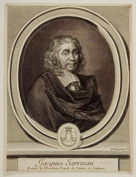 Editor: This is a portrait of Daniel Colwal by Robert White. It looks like an engraving. I'm struck by the framing device, it feels very celebratory. What do you see in it? Curator: It's interesting you noticed that! These portraits were often commissioned by institutions to promote benefactors. The ornament is a nod to power, yes, but what kind of power? How do we see Colwal positioned within the larger social structures of his time through this image? Editor: So, it's about who gets remembered, who gets celebrated, and by whom? Curator: Precisely. And what this image tells us about their values and the power dynamics at play. It's not just a portrait, it's a statement. Editor: It makes me think about who gets memorialized today, and how. Curator: Exactly! The portrait becomes a lens to examine our own biases and the stories we choose to tell.