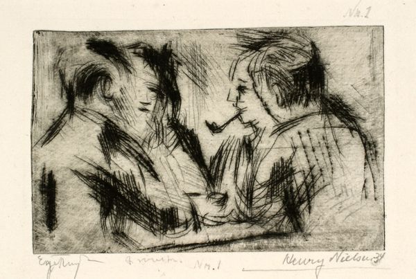 Editor: This pen and ink drawing, "Chess Players" by Lovis Corinth from 1918, really strikes me with its frenetic energy. The lines are so scratchy and urgent. What do you see in this piece? Curator: I'm drawn to the very *act* of mark-making here. The furious hatching and cross-hatching isn’t just depicting figures, it’s materializing a feeling. Corinth's labour is evident, each stroke a deliberate action, fueled by… perhaps, the anxieties of the time? What does this process suggest about the artist’s relationship to his materials, and the scene he depicts? Editor: The energy definitely feels anxious. You can almost *hear* the scratching of the pen on the paper. It doesn’t feel like leisure, but more like an attempt to find some order or control. Curator: Precisely. Consider the social context: 1918, the end of World War I. Resources were scarce. This work on paper, this immediacy of ink, suggests a constraint, doesn't it? It eschews grand, opulent materials. There is a sort of "commonness" to both material and scene here. But what might the implications be of representing that scene, with these chosen, deliberately rough strokes? Is this 'chess' an elevated game or just… work? Editor: I never thought about it that way! It's like the cheapness of the materials highlights a different kind of tension, a sense of ordinary lives being lived during extraordinary times, away from heroic battlefields. Curator: Exactly. It raises questions about the very value we place on art, and on everyday scenes depicted in it. It moves us beyond idealizing grand themes of glory and competition, to focus on materials, labor, and the broader context of production. And that kind of refocusing gives even familiar images renewed meanings. Editor: Thinking about the pen strokes and the social context together gives the work a whole new layer of meaning. I now see it as both representation, and index of a fraught moment in history. Thank you! Curator: My pleasure! Now, to really delve deep, perhaps consider how consumption of art also reflects class tensions!